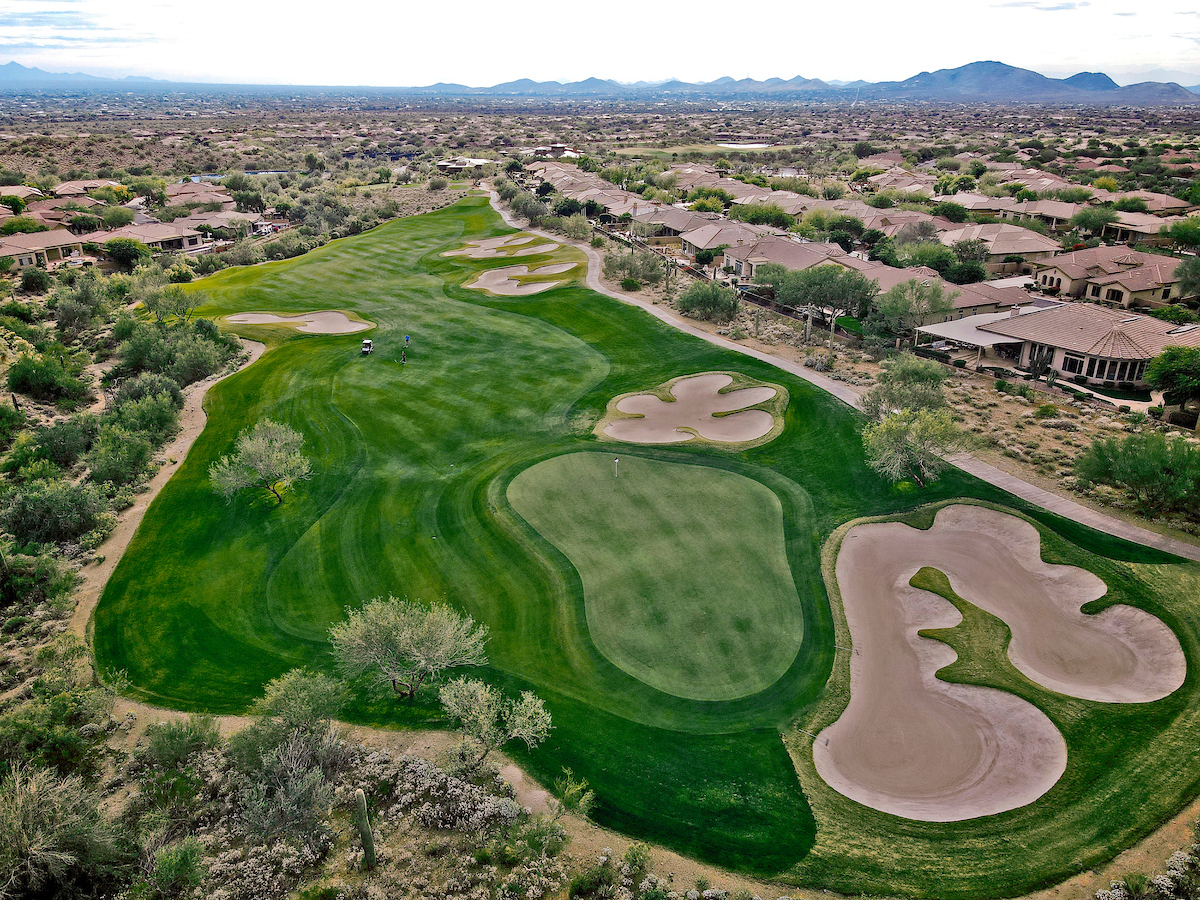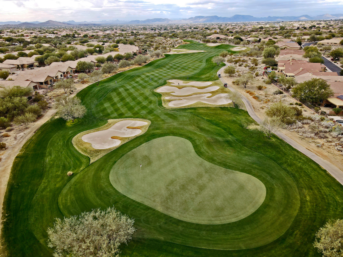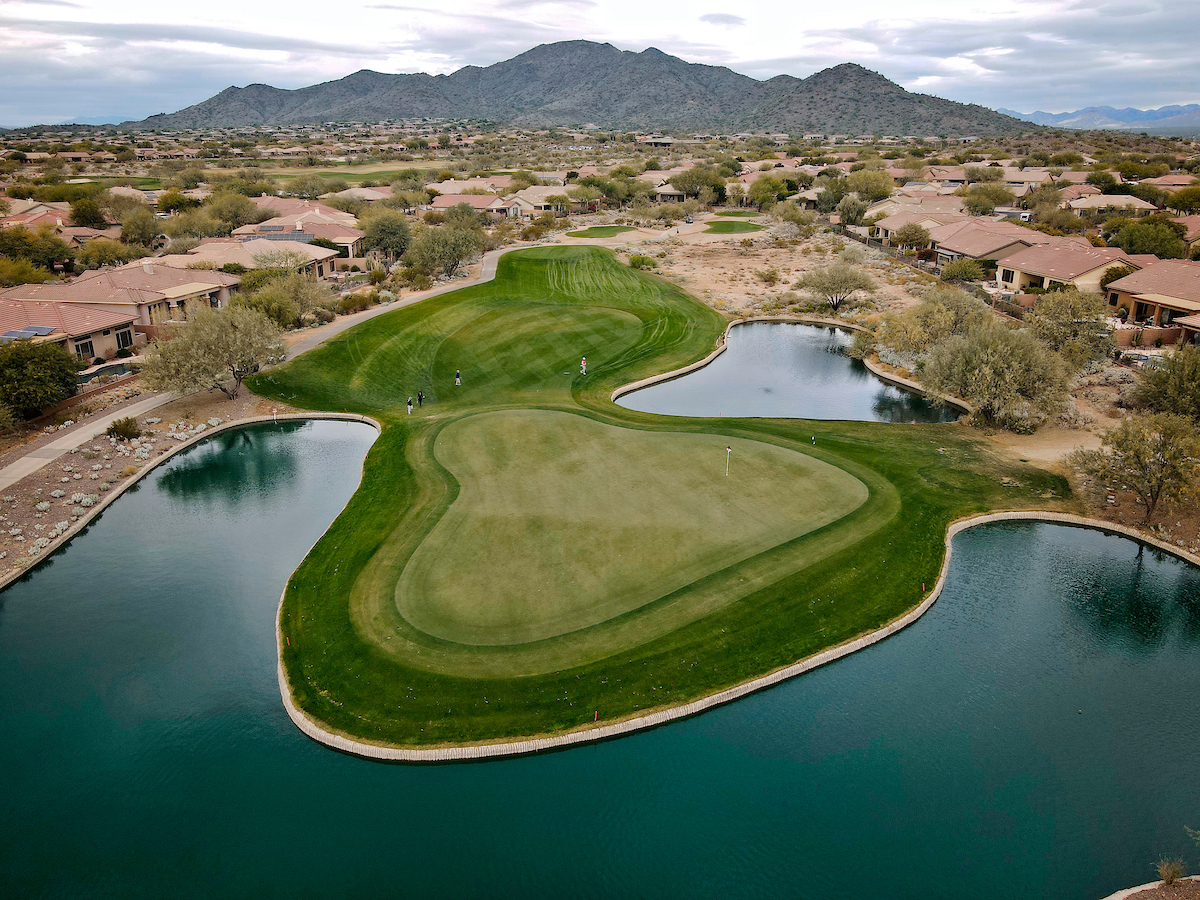 The Ironwood Course, which opened in January 2004 as a Phoenix private golf course, encompasses seven water features, intimidating bunkers, and a backdrop of a mountain mesa. This is a classic high-risk/high-reward design and the more challenging of the two Anthem, Arizona golf courses. Post-round conversation often focuses on “Anthem Alley,” the 10th through 12th uniquely crafted water holes that tend to drive up scores.