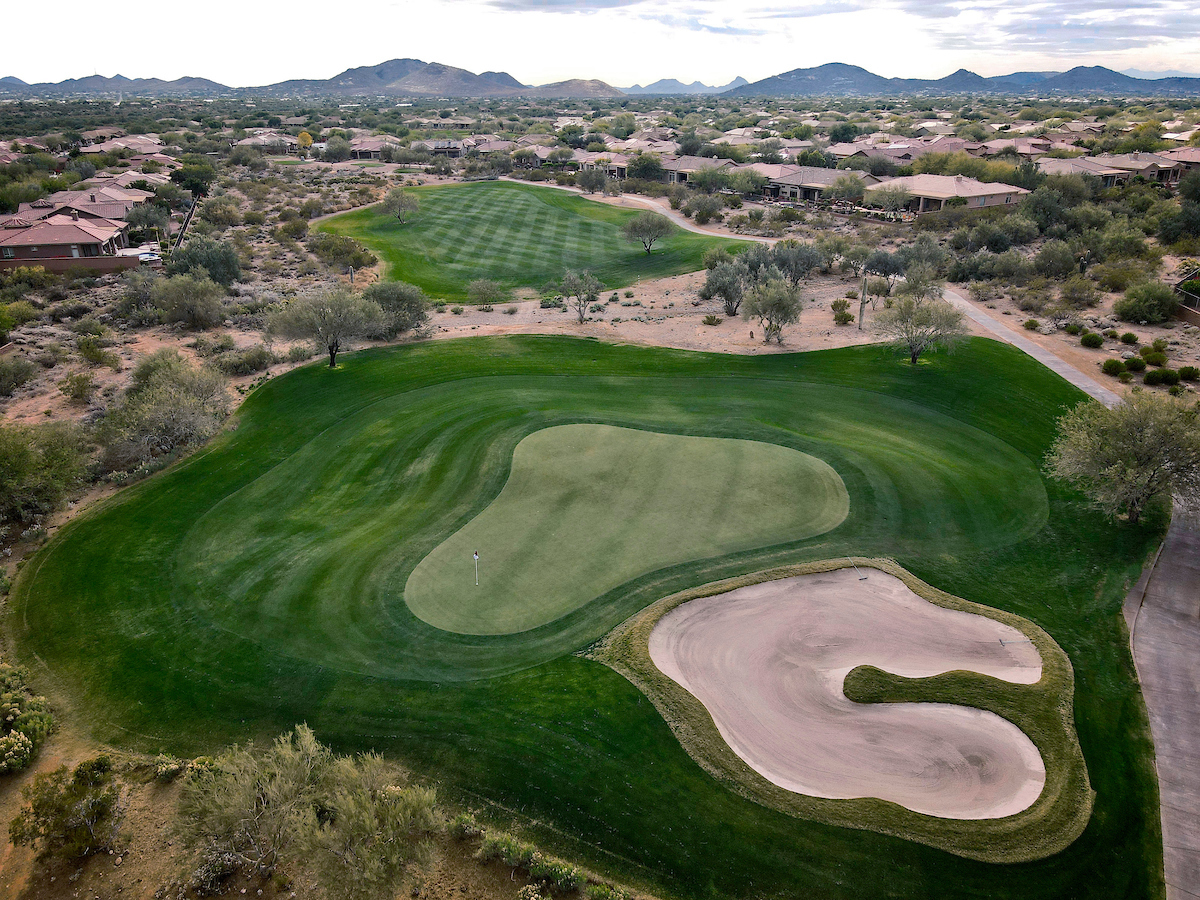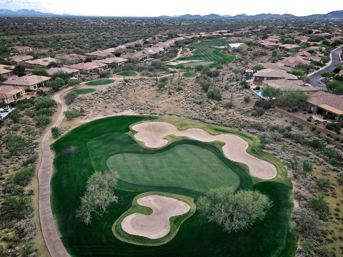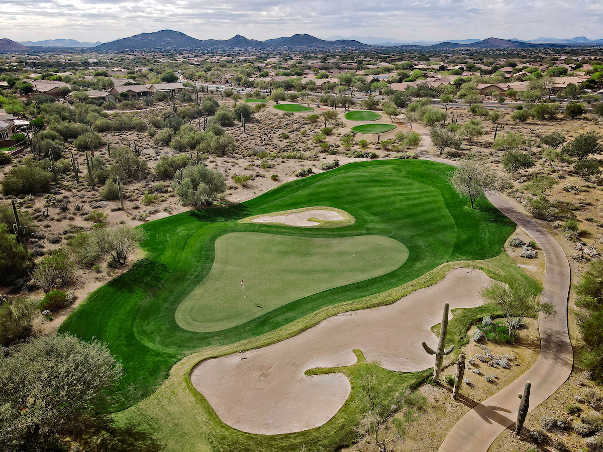 The Ironwood Course, which opened in January 2004 as a Phoenix private golf course, encompasses seven water features, intimidating bunkers, and a backdrop of a mountain mesa. This is a classic high-risk/high-reward design and the more challenging of the two Anthem, Arizona golf courses. Post-round conversation often focuses on “Anthem Alley,” the 10th through 12th uniquely crafted water holes that tend to drive up scores.