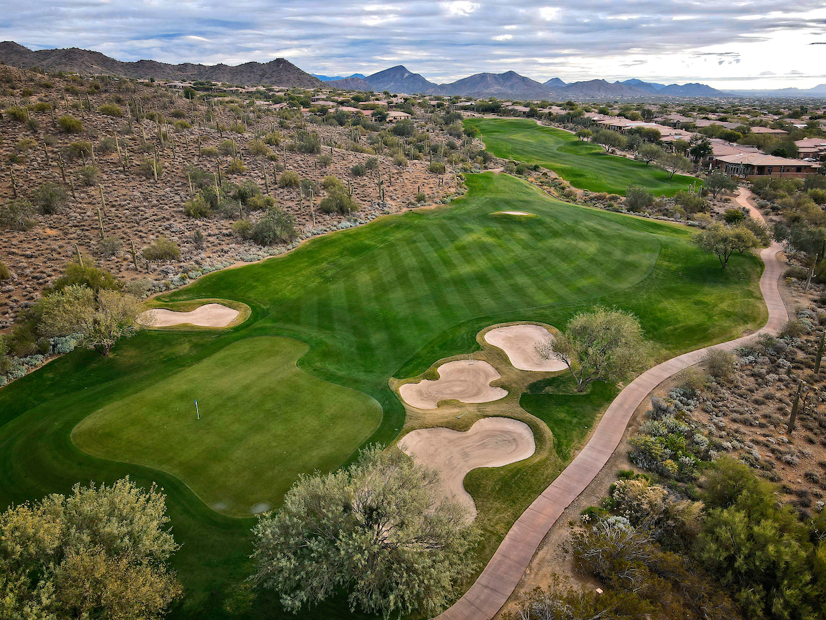 | A deep canyon wash on the left sets up this long, uphill par 3. The large, tiered green is protected by flanking bunkers. A short tee shot will find a very steep grass depression. |