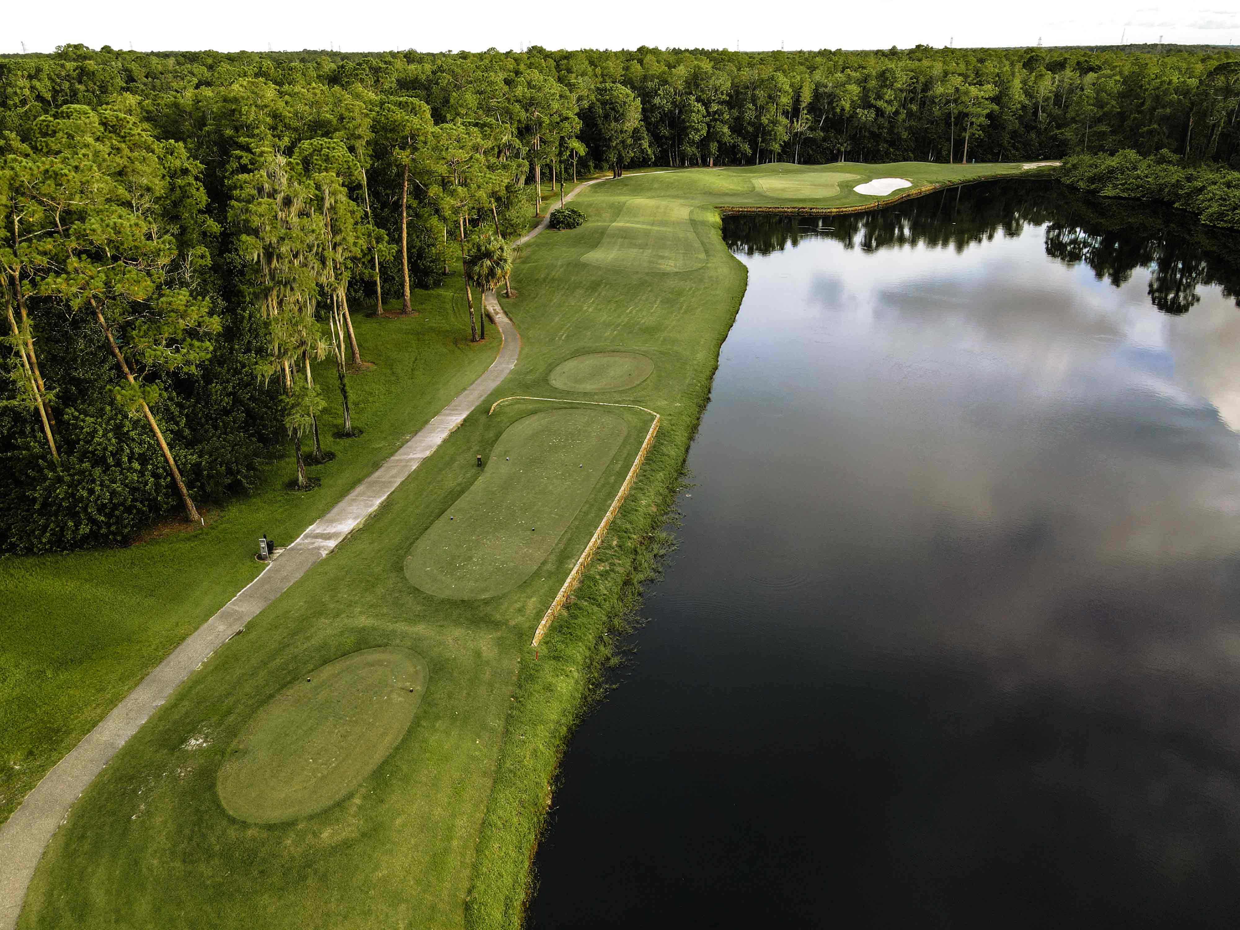 | Signature hole, three shot par 5, important to miss the fairway bunkers, water and bunkers guard the green |