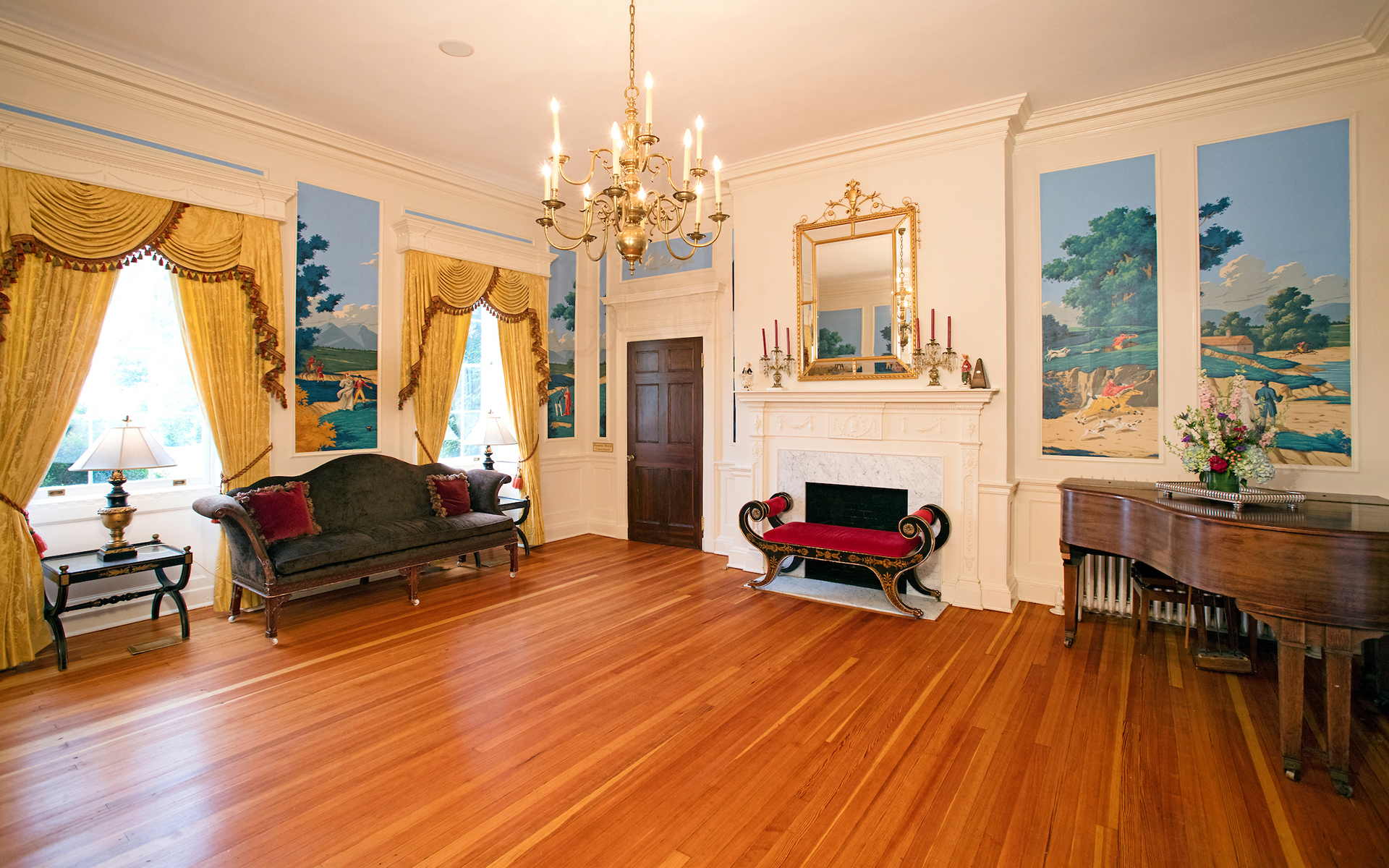 A grand receiving room where legend has it, General Lafayette’s donated mantle piece rests. The design of the hand-painted walls is based on an original French painting of 1812 depicting a deer hunt at the Chateau de Compiegne.