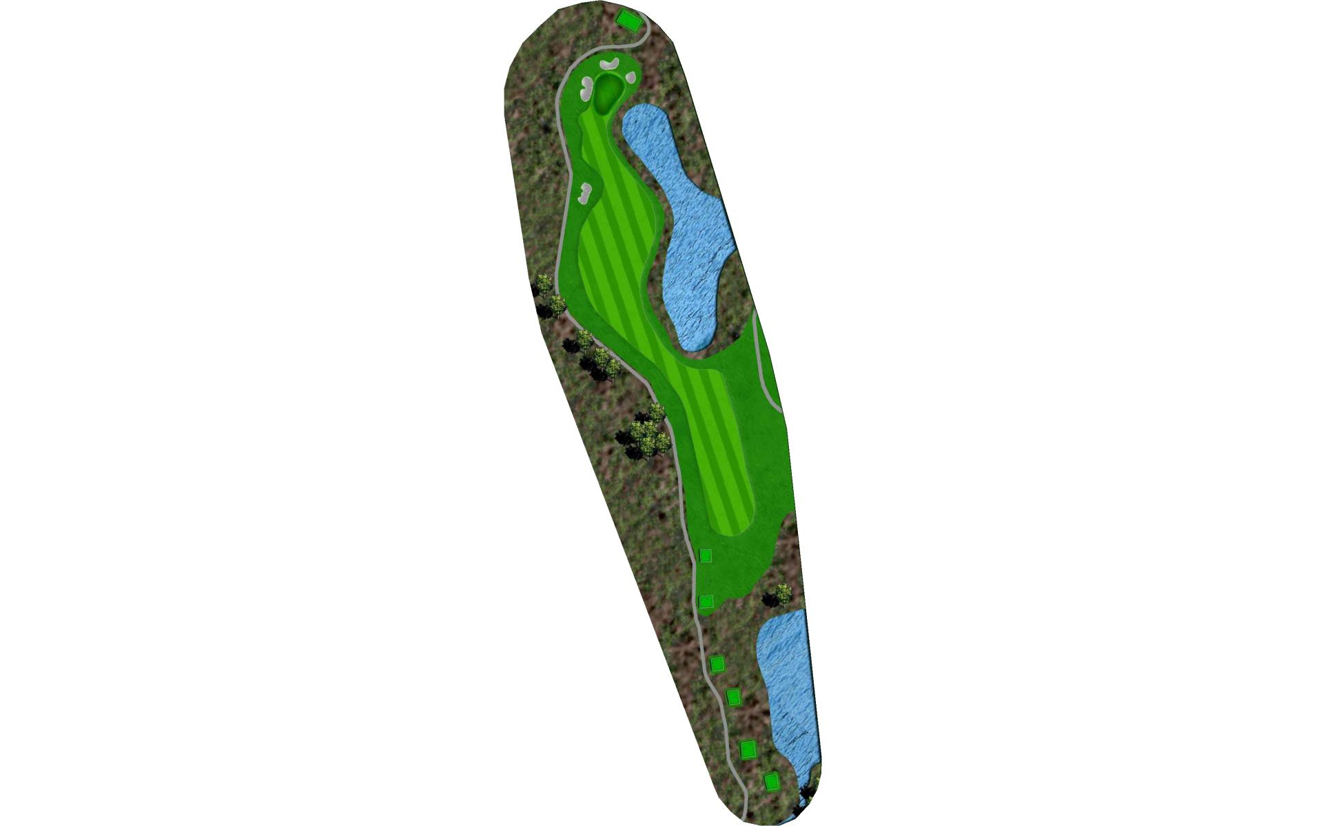 | The aiming point on this par 5 is just left of the 250 post in the fairway to avoid the water. Players going for the green in two should aim to the left side of this multi-tiered green which is protected by water on the right. |