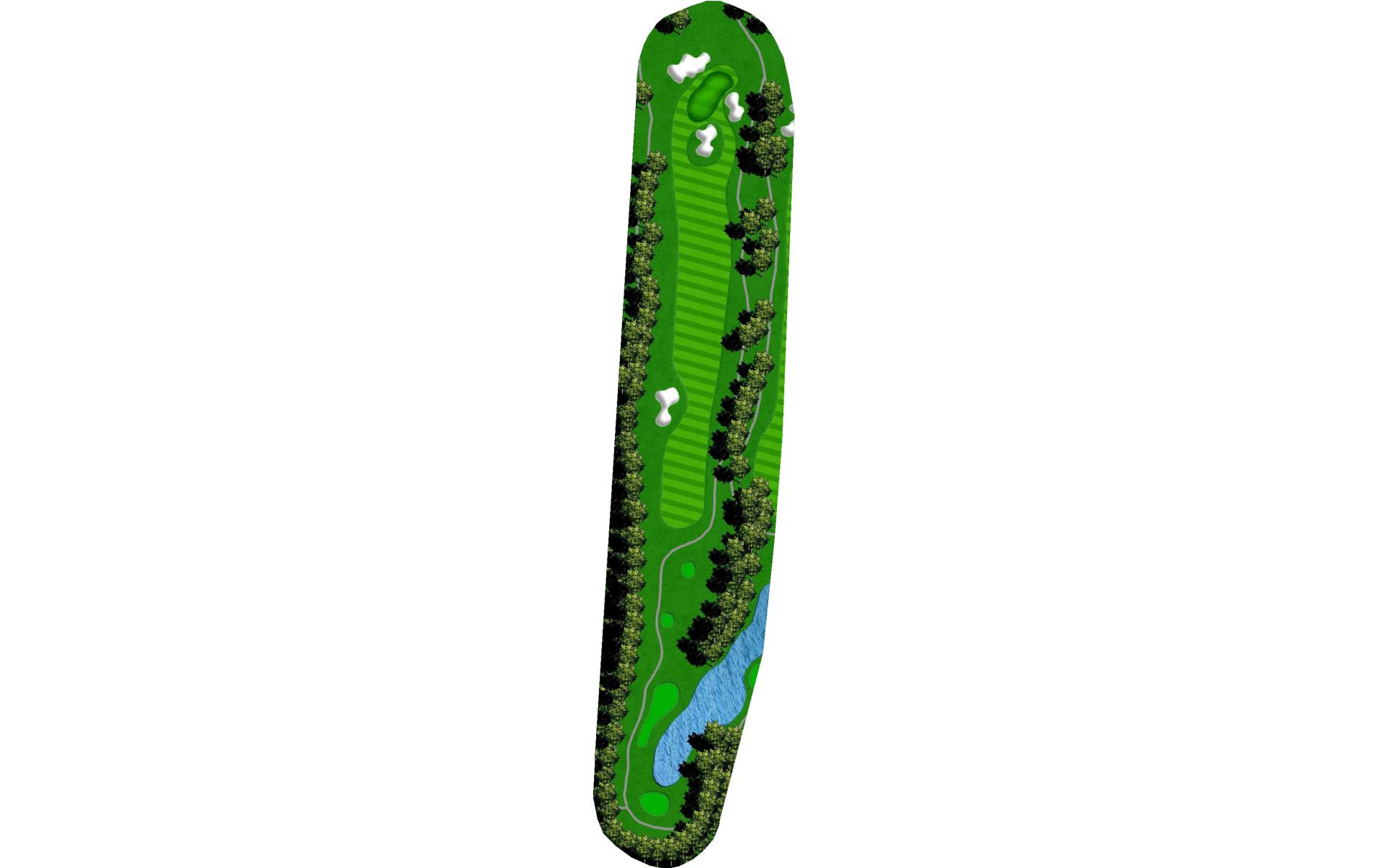 This dogleg left par 4 requires a tee shot, from the black tees, of about 200 yards and favoring the right side. The approach shot travels over a green to a green with two bunkers on the left side.