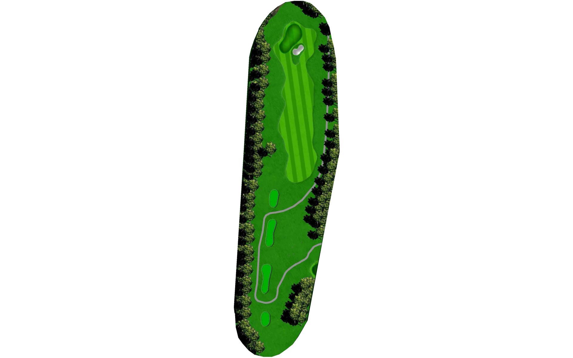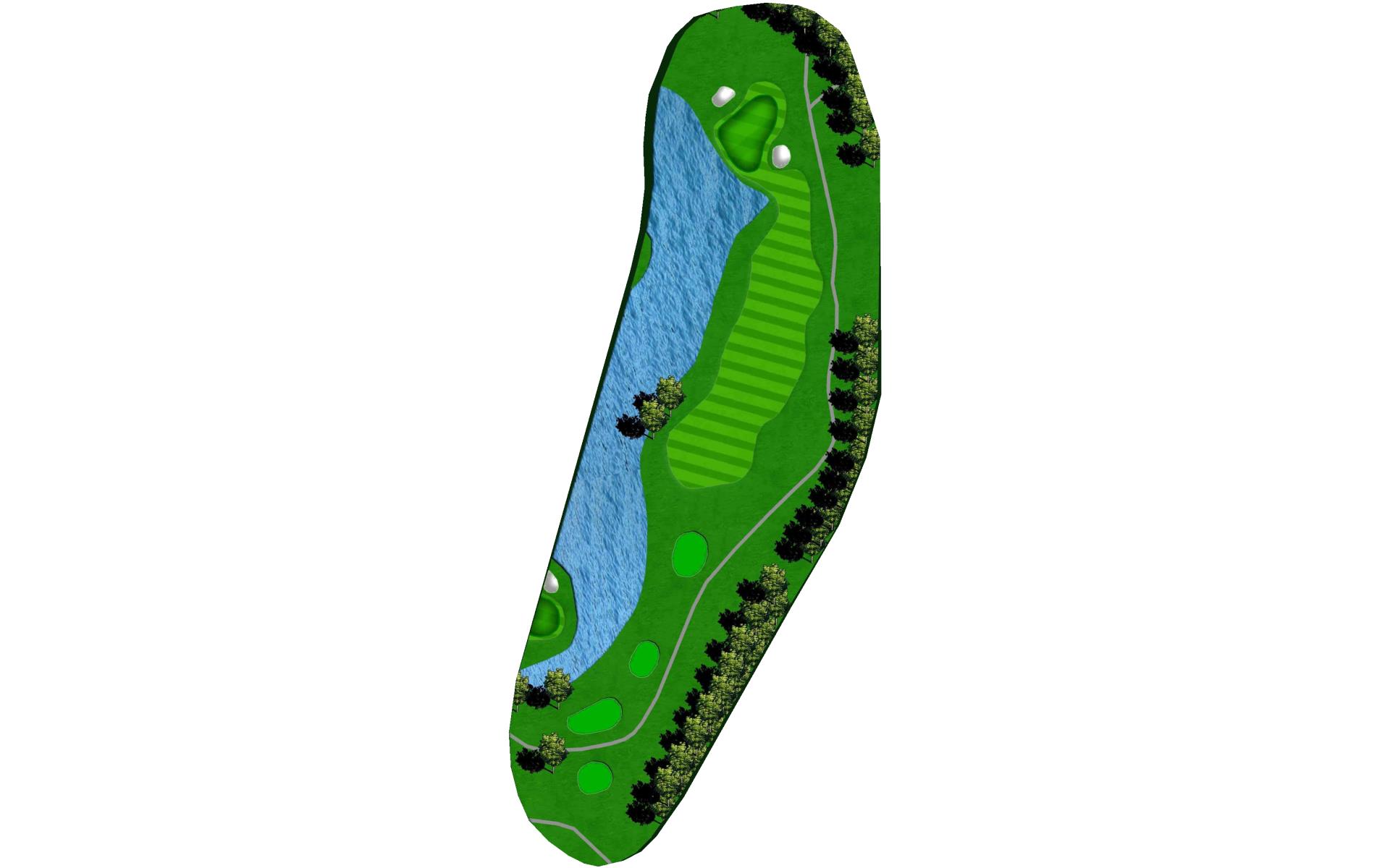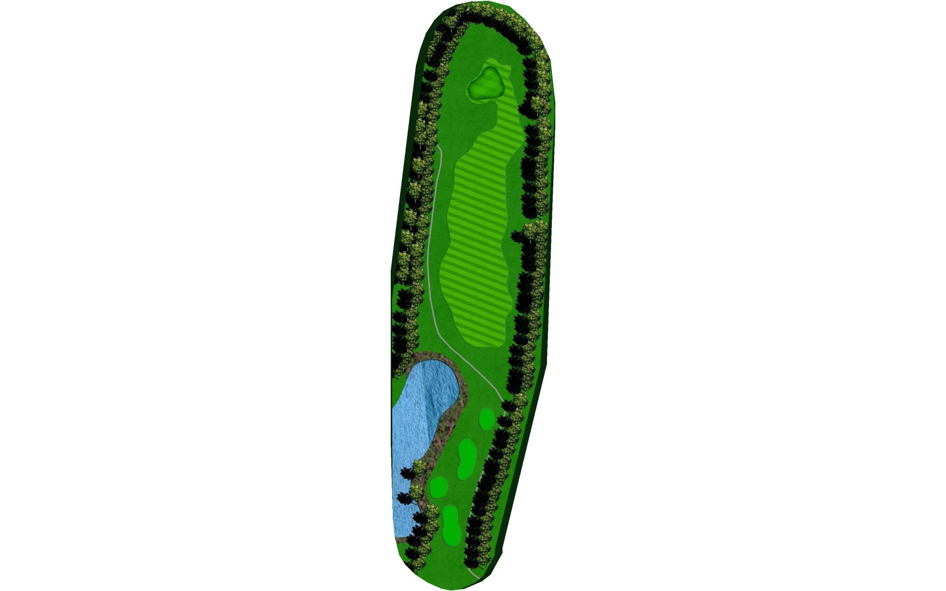 With a forced carry off the tee and water down the entire left side, this is the hardest hole on the course. Aim your tee shot just short of the bunker to leave yourself a 125 to 175 yard shot to the green. With a huge slope in the middle of the green, your approach shot should land near the front of the green if you wish to have a putt for birdie.