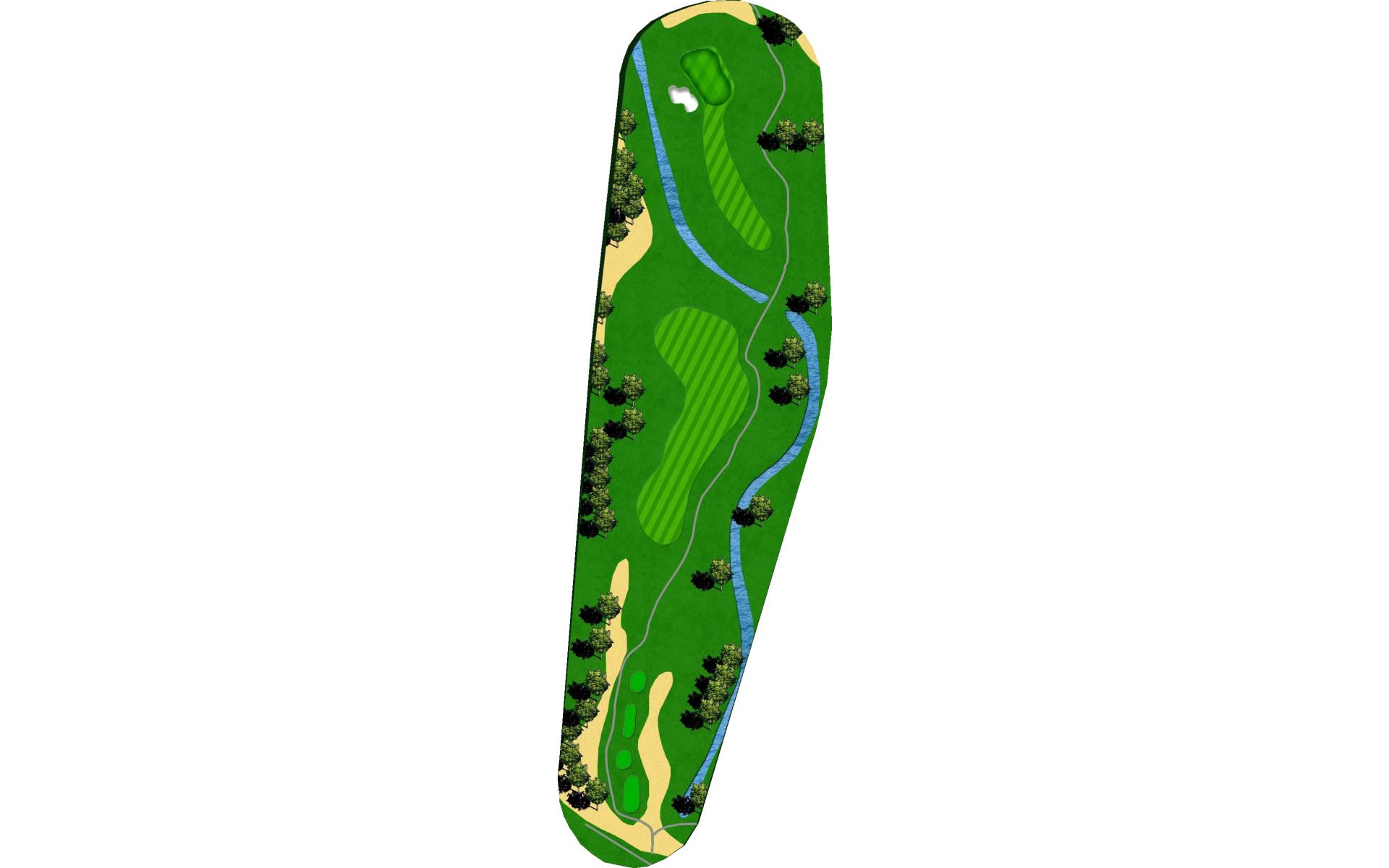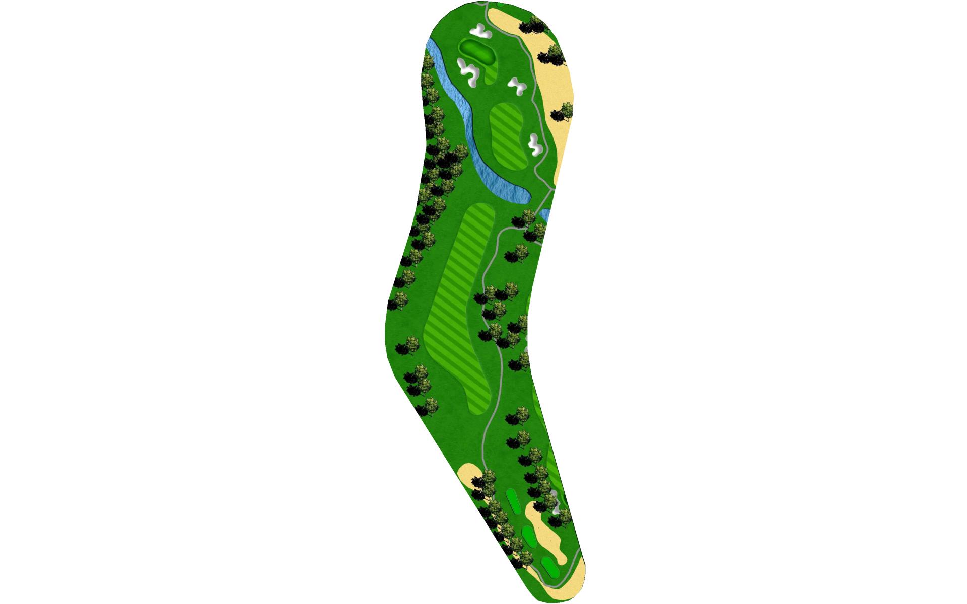 A fun par 5 that doglegs to the right, this hole challenges players to hit a high left to right shot over the trees guarding the right corne…