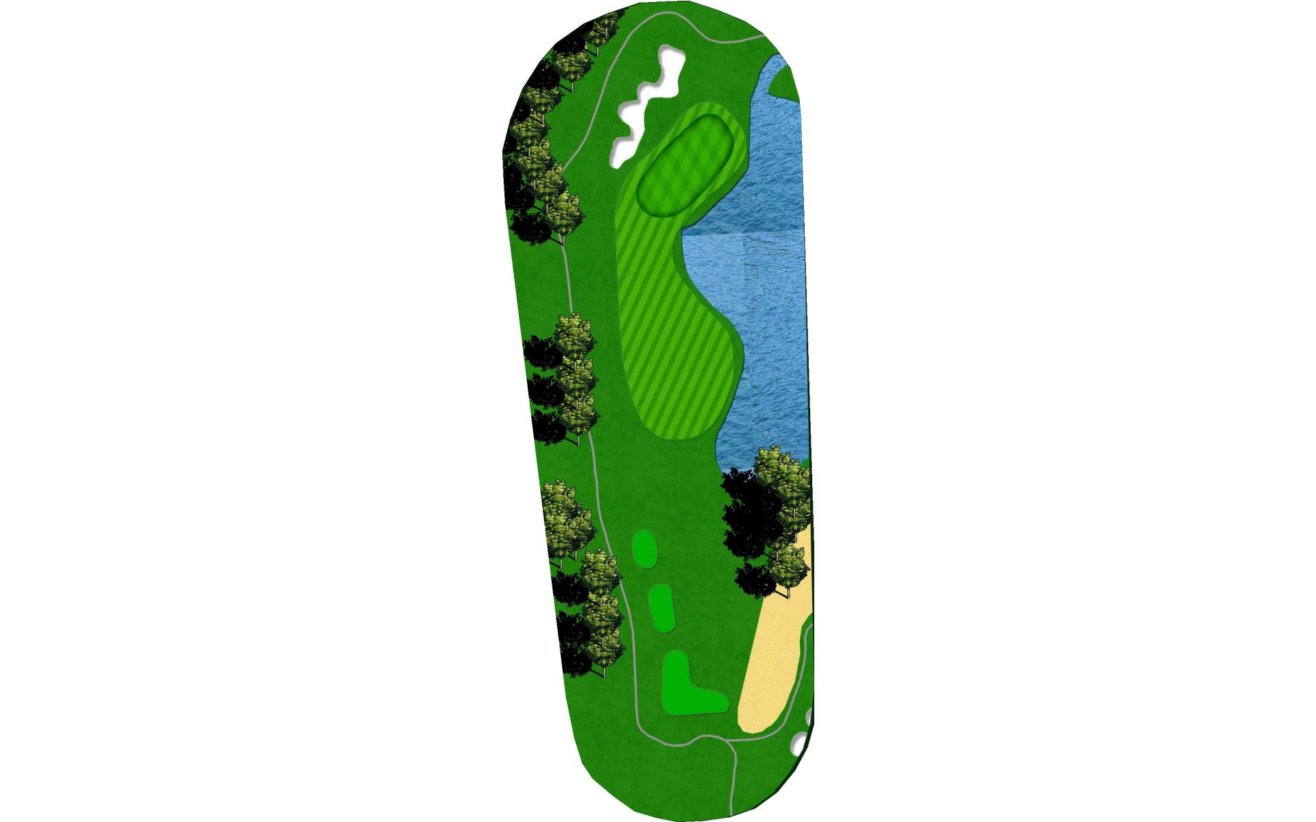 This shorter par 3 is defined by the beautiful waterfall and lake to the right. Distance control is paramount to setting up a birdie putt.
