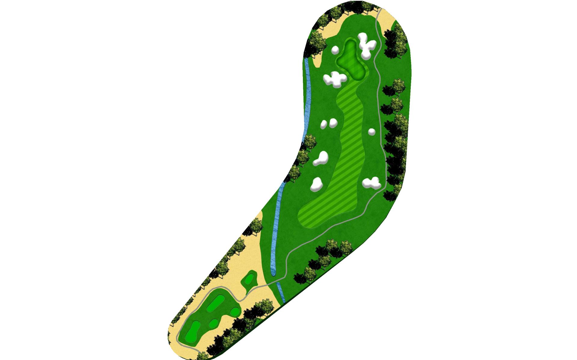 This short par 4 requires a decision on the tee shot. The aggresive play is to drive over the creek to the front of the green, a more conservative play is to lay up to the right of the fairway bunker for a short iron into the green.