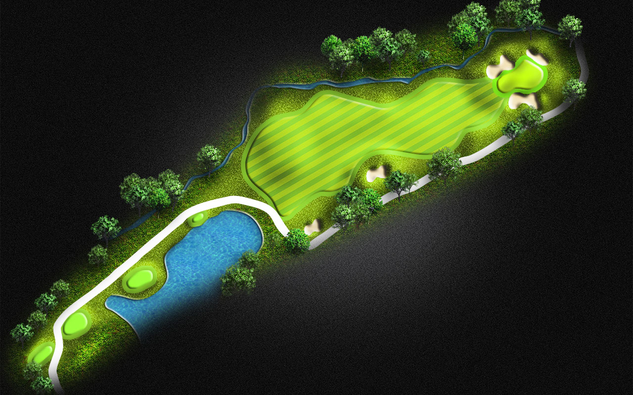 A demanding tee shot on the Par 5 is crucial. You must lay up between the water on the right and left. Long hitters will have a chance to get to the green in 2.