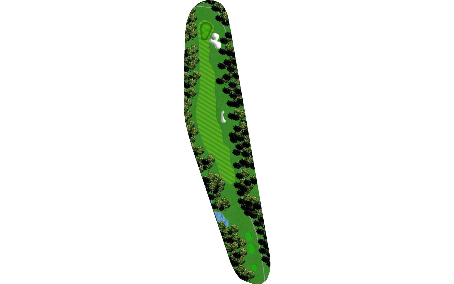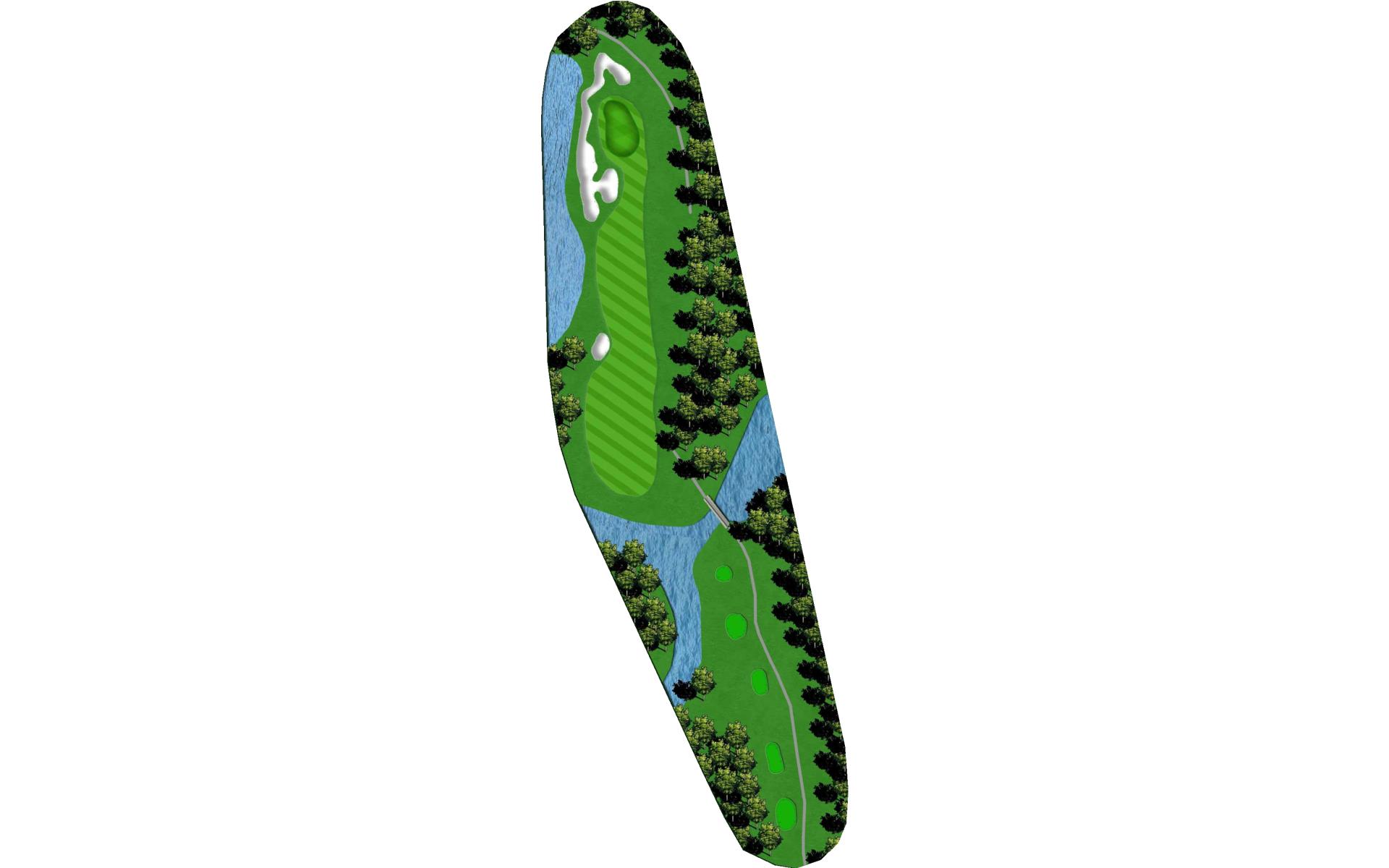 A demanding and intimidating straightaway par 4 with OB left and water on the right. The fairway is roomier than it may appear so let go of the steering wheel and let her rip.