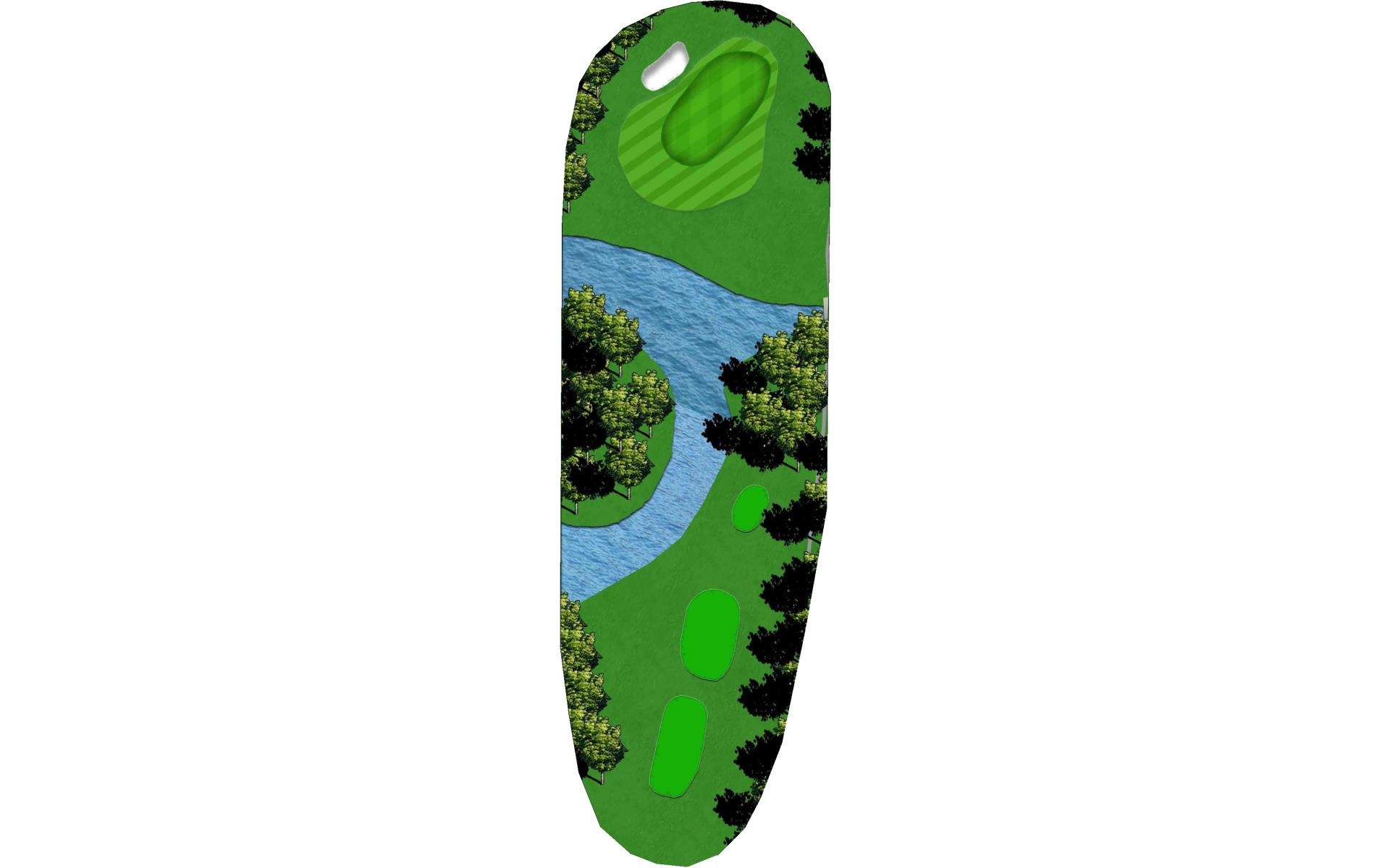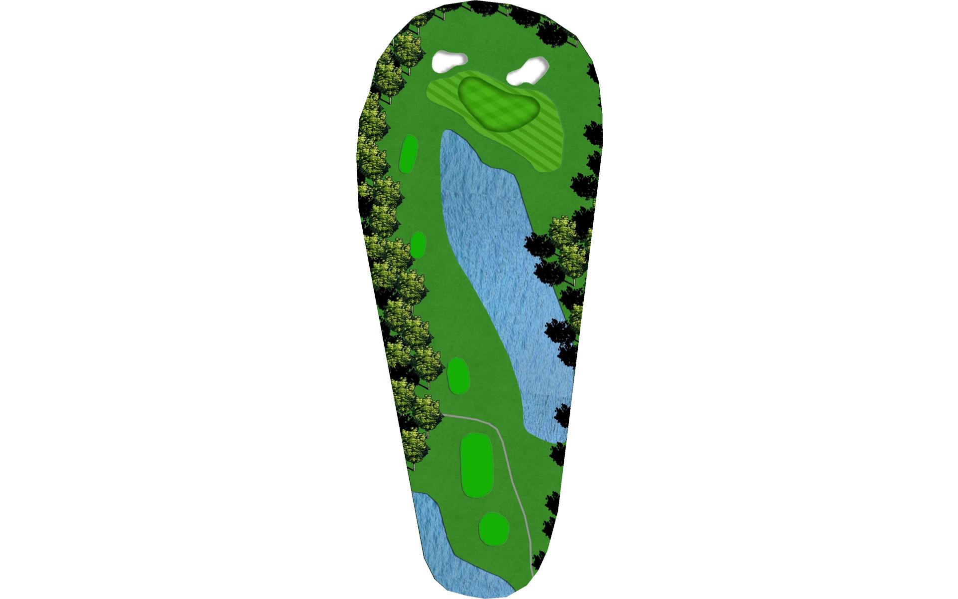 A par three in which you have a lagoon to carry with a steep front at the green. Hit an extra club or you're probably playing your third shot from the drop area.