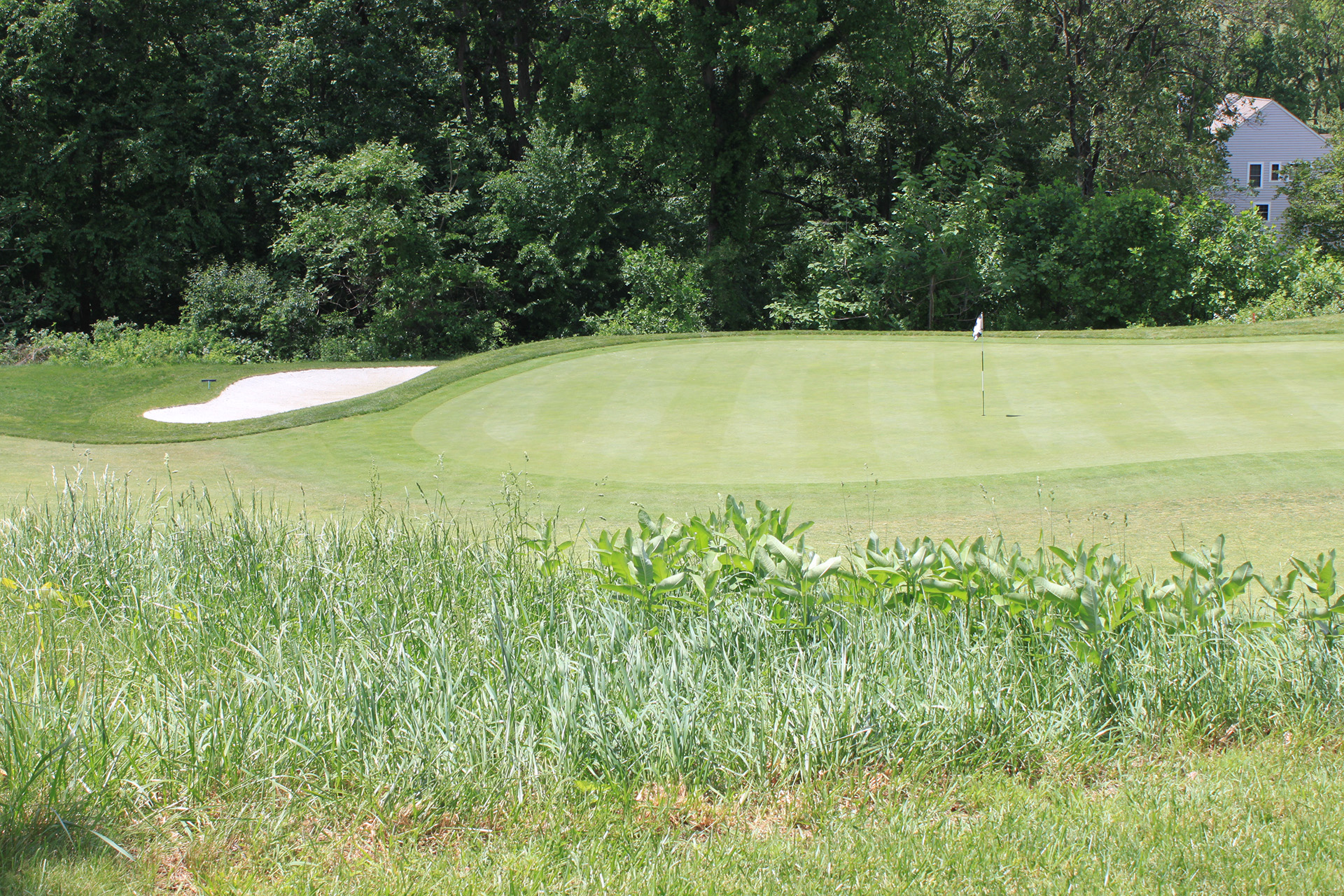 A short par 5 that doglegs slightly to the right around a grove of tall trees. Hitting the green in two requires two precise shots into a wide, but two-tiered green.