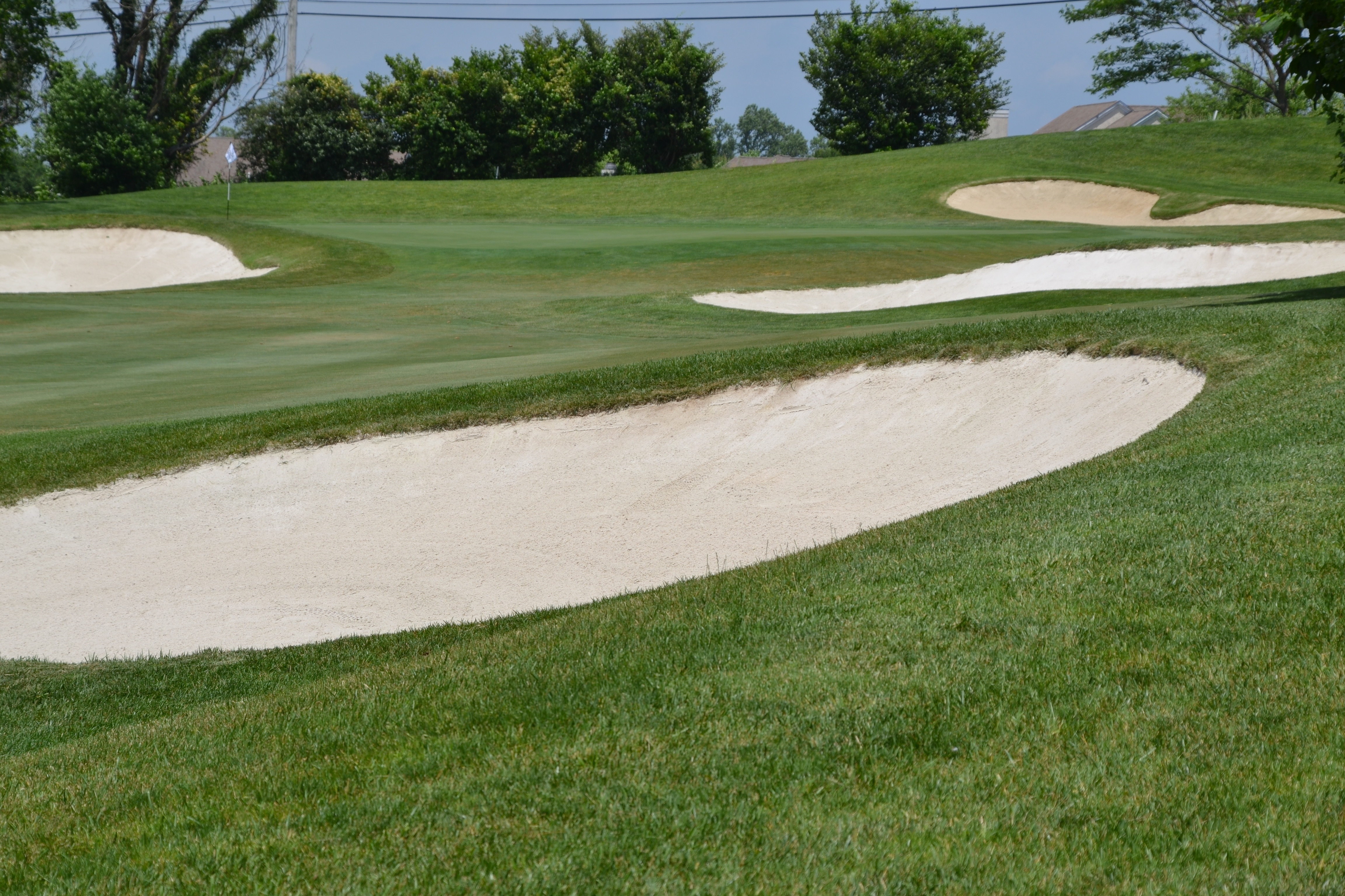 The back nine opens with a blind tee shot with trees right and a large bunker on the left. The approach shot on this par 4 plays downhill and anything left tends to kick back to the right. A deep bunker guards the putting surface on the front-right.