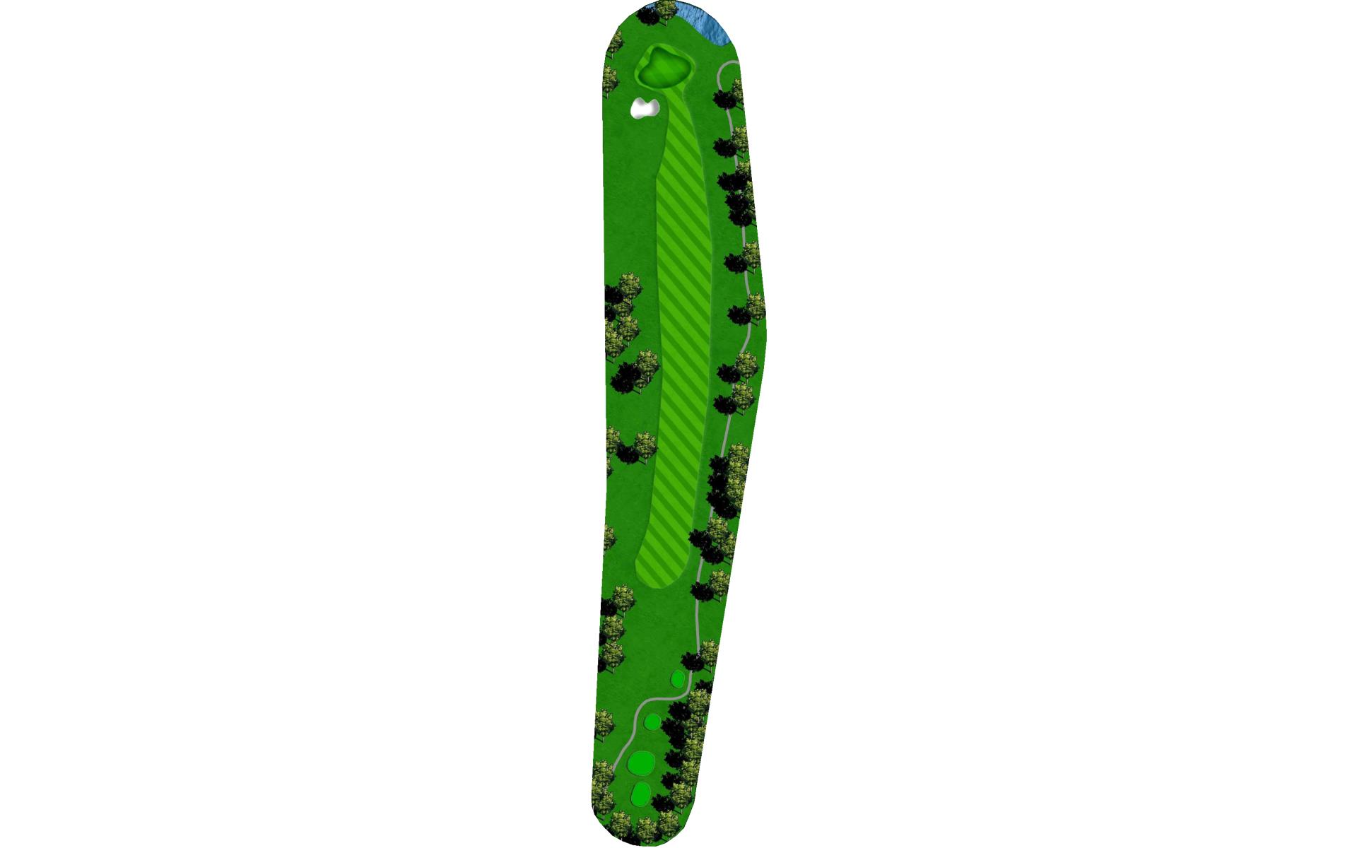 Slight dogleg right requires a drive center to left of the fairway to open up your approach shot to the green. The green is at an angle so proper club selection is a must. Plenty of room right of the green allows you room to save par.