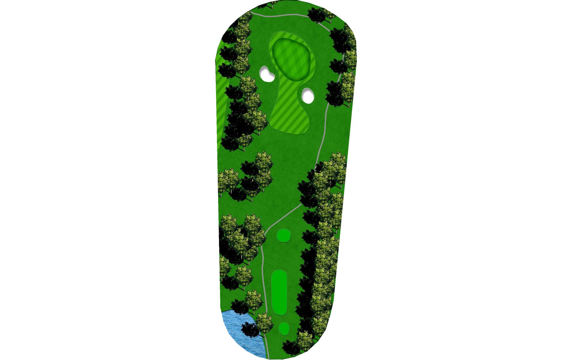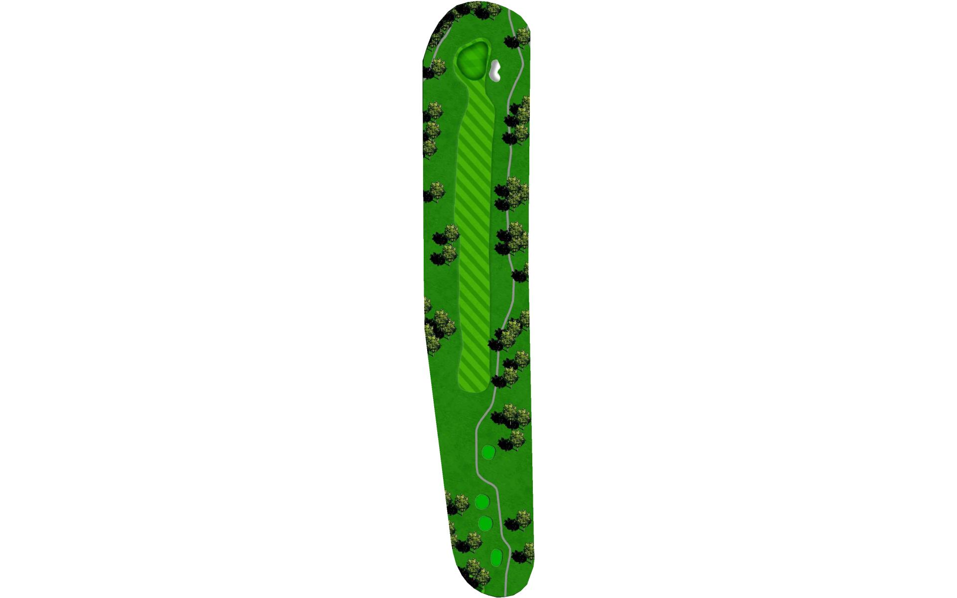 A chance to take a breather off the tee as there are no bunkers or penalty areas. A large green slopes back to front and a crescent shaped bunker on the right.