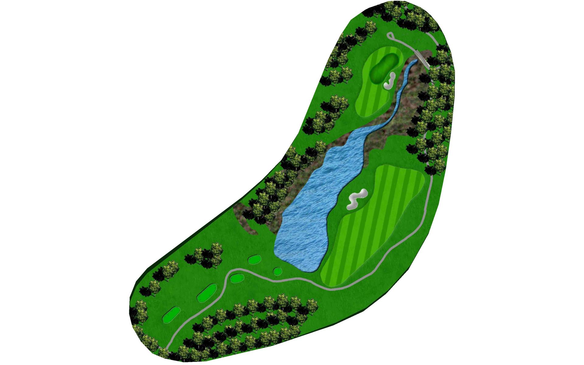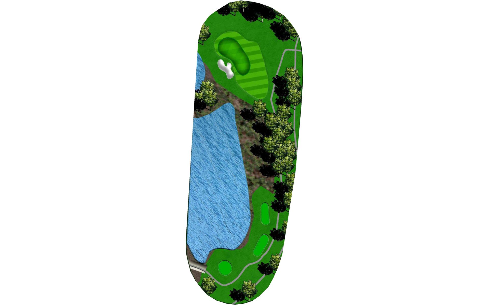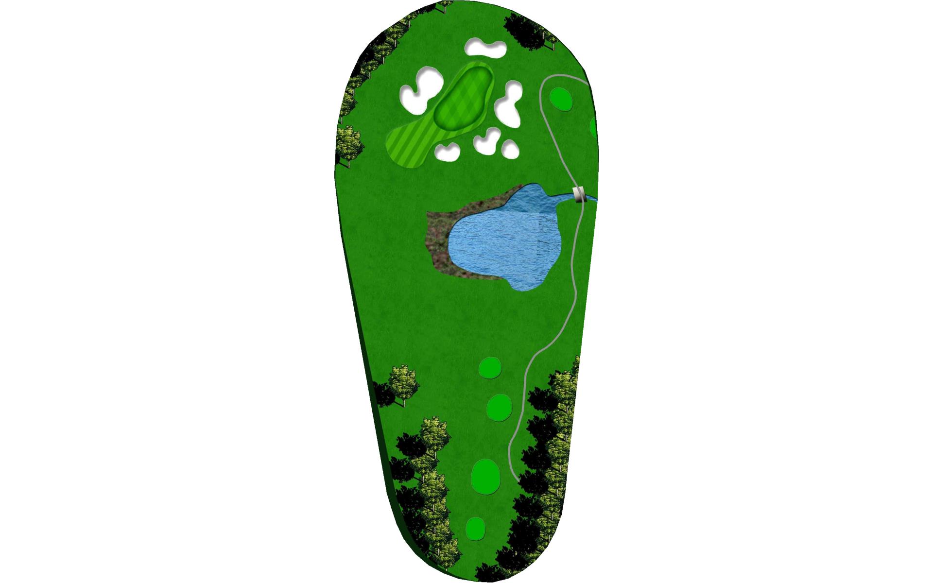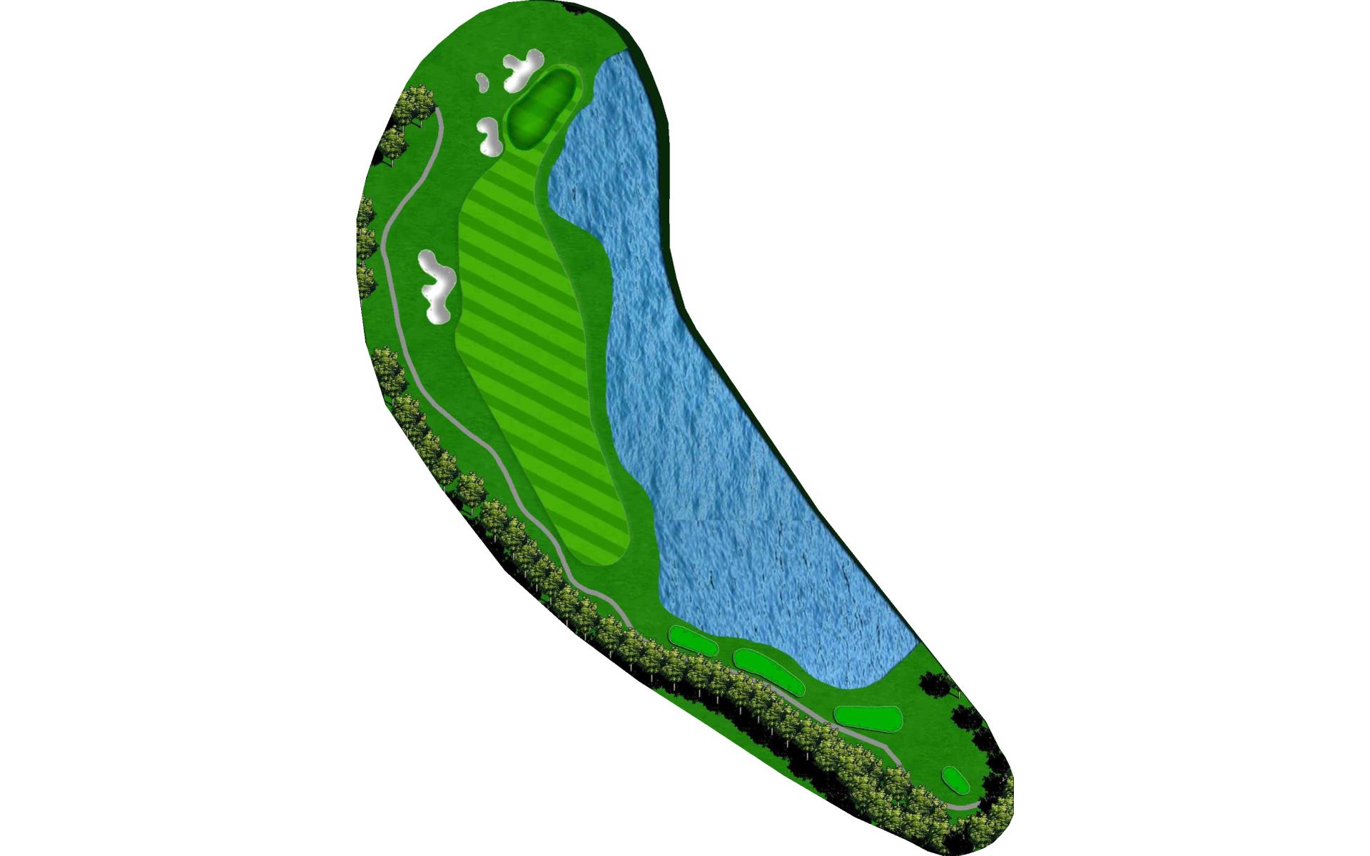 A beautiful par 3 nestled behind a small pond. The slightly elevated, extremely undulated green is well protected by green side bunkers. Anything short will end up in the pond or bunkered.