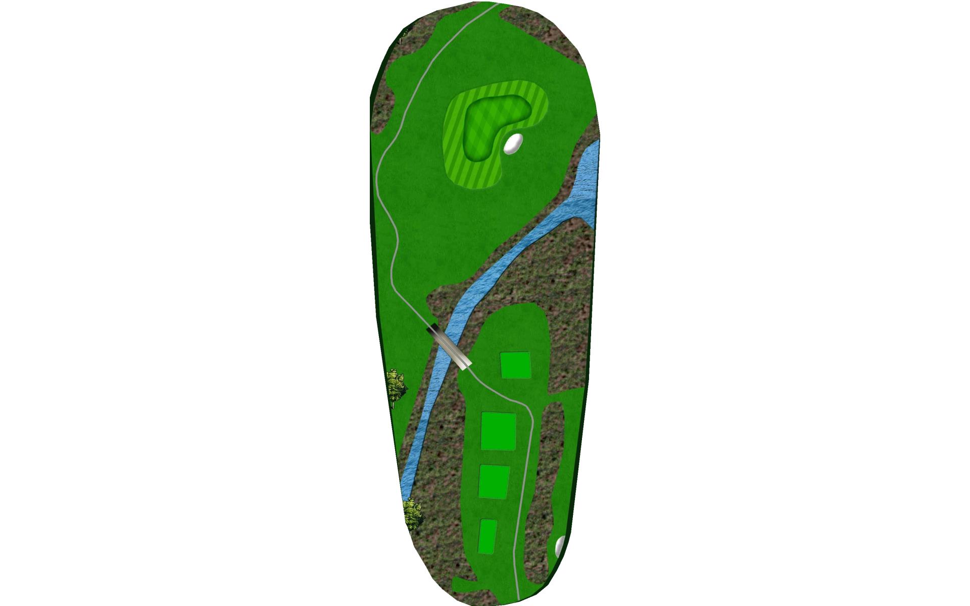 It is a long way to the flanking bunkers, so aim at the mound in the center. Your second shot is bound to be a long one, so craft it between the mounds. Watch out, the green falls away back right.