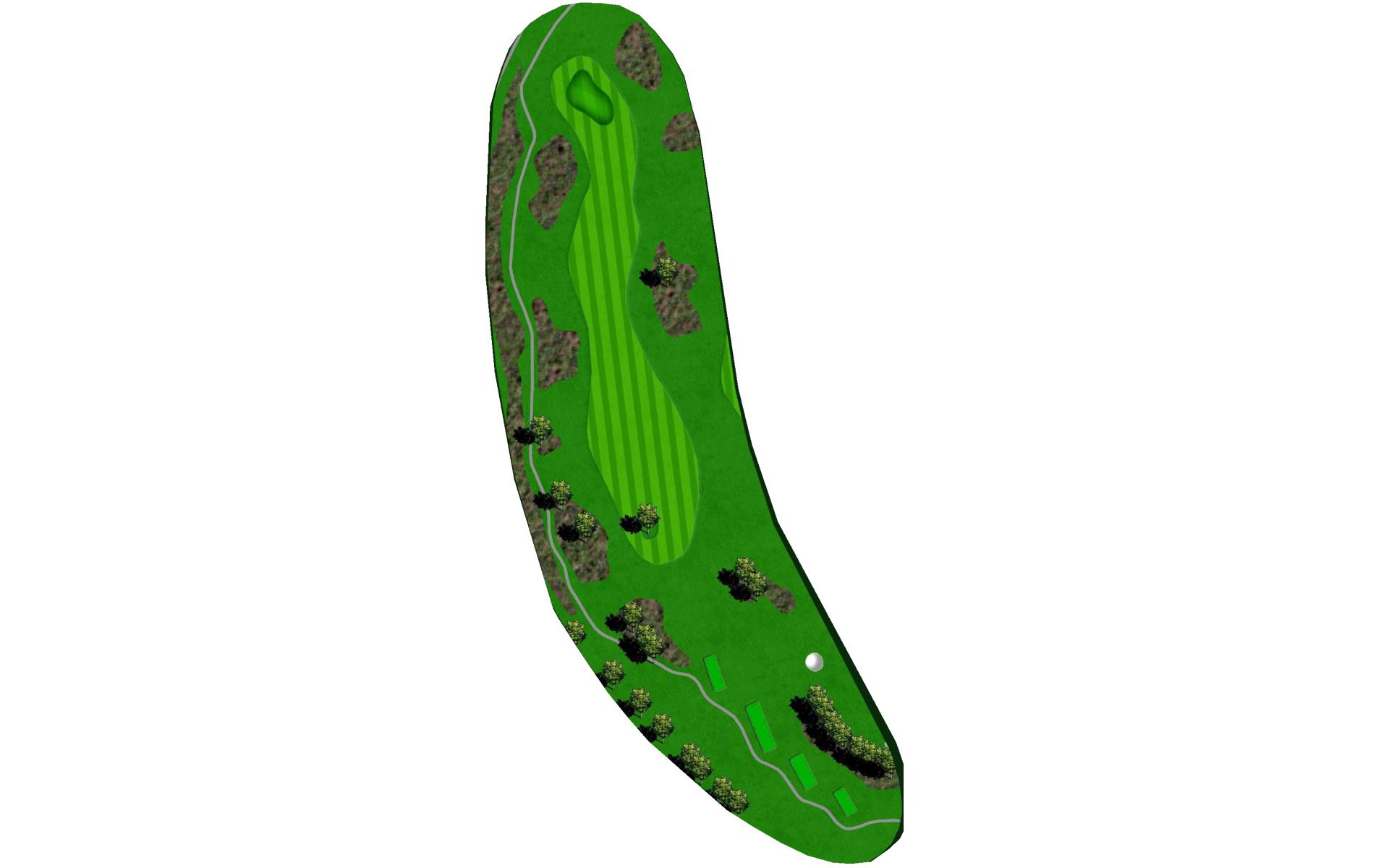 This short Par 4 needs to be approached from the right side to avoid the three bunkers to the left of the green. The green is extremely demanding, and the pin is partially obscured when placed on the left side. Use a long iron or a fairway metal and aim at the target bunker to the right of the green.