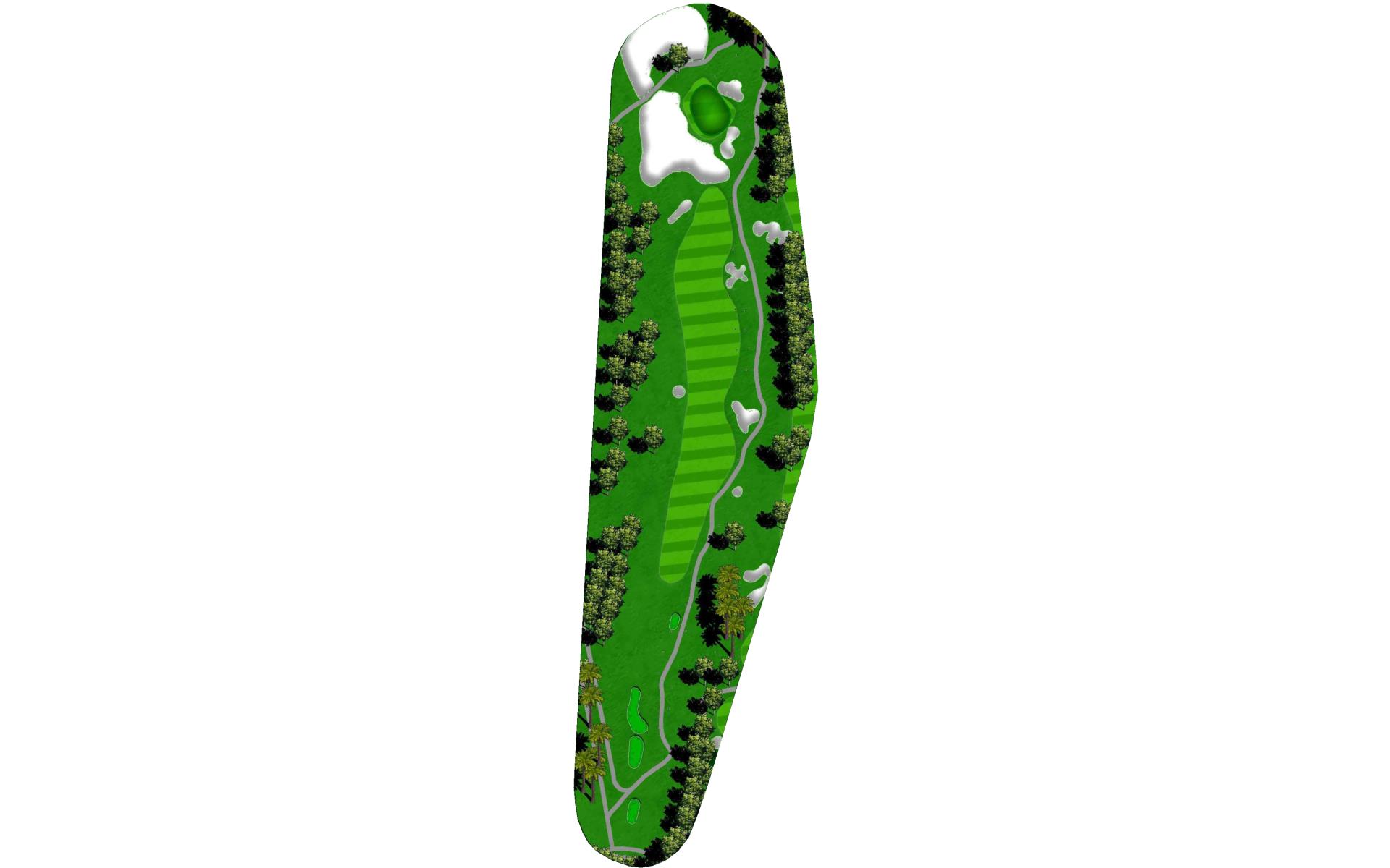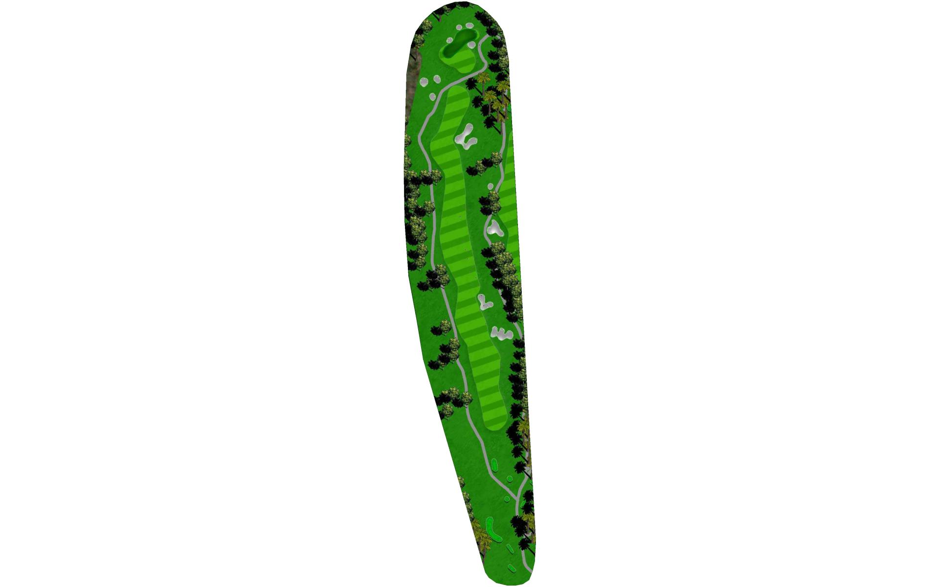 This extremely narrow fairway is well guarded by trees both right and left. Favor the left side of the fairway and your second shot will be easier on the eyes. Stay below the hole and a four is in the bag.