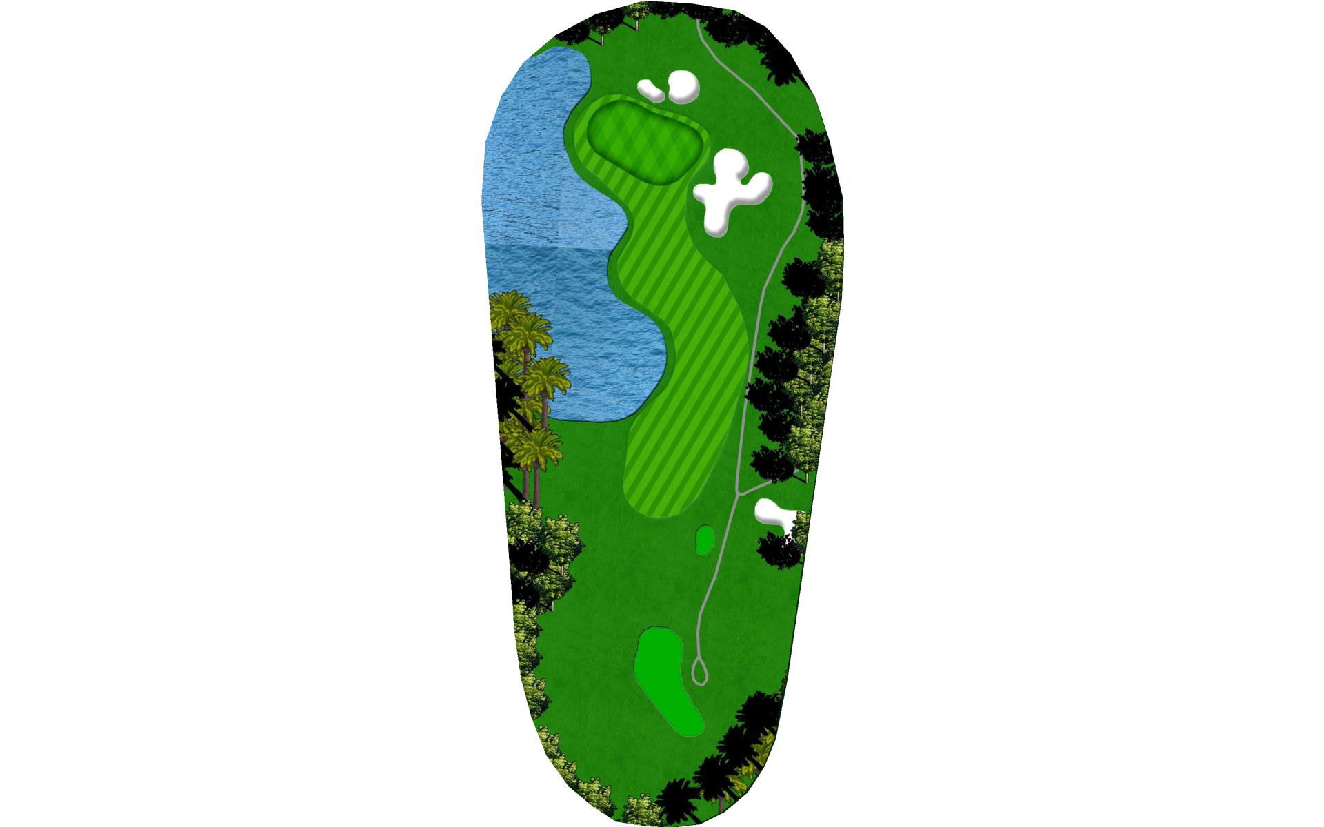 This severe dogleg left can be shortened if you dare to hit a driver over the towering palms on the left. If not, a 3 wood with a slight draw will leave you with a mid- to long iron into this back-to-front sloping green. Below the hole is a must.