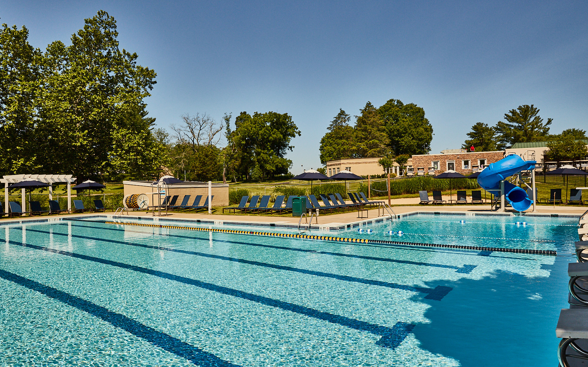 Norbeck’s swimming facilities welcome both family-oriented and competitive swim activities. Professionally staffed aquatic activities offer Members a full range of swimming lessons and a competitive swim team program. Nestled in a picturesque tree-lined grove featuring 75-year-old maple trees and overlooking the golf course, the main pool features lap lanes and an inviting toddler’s area. A separately fenced baby pool is conveniently located adjacent to the main pool.