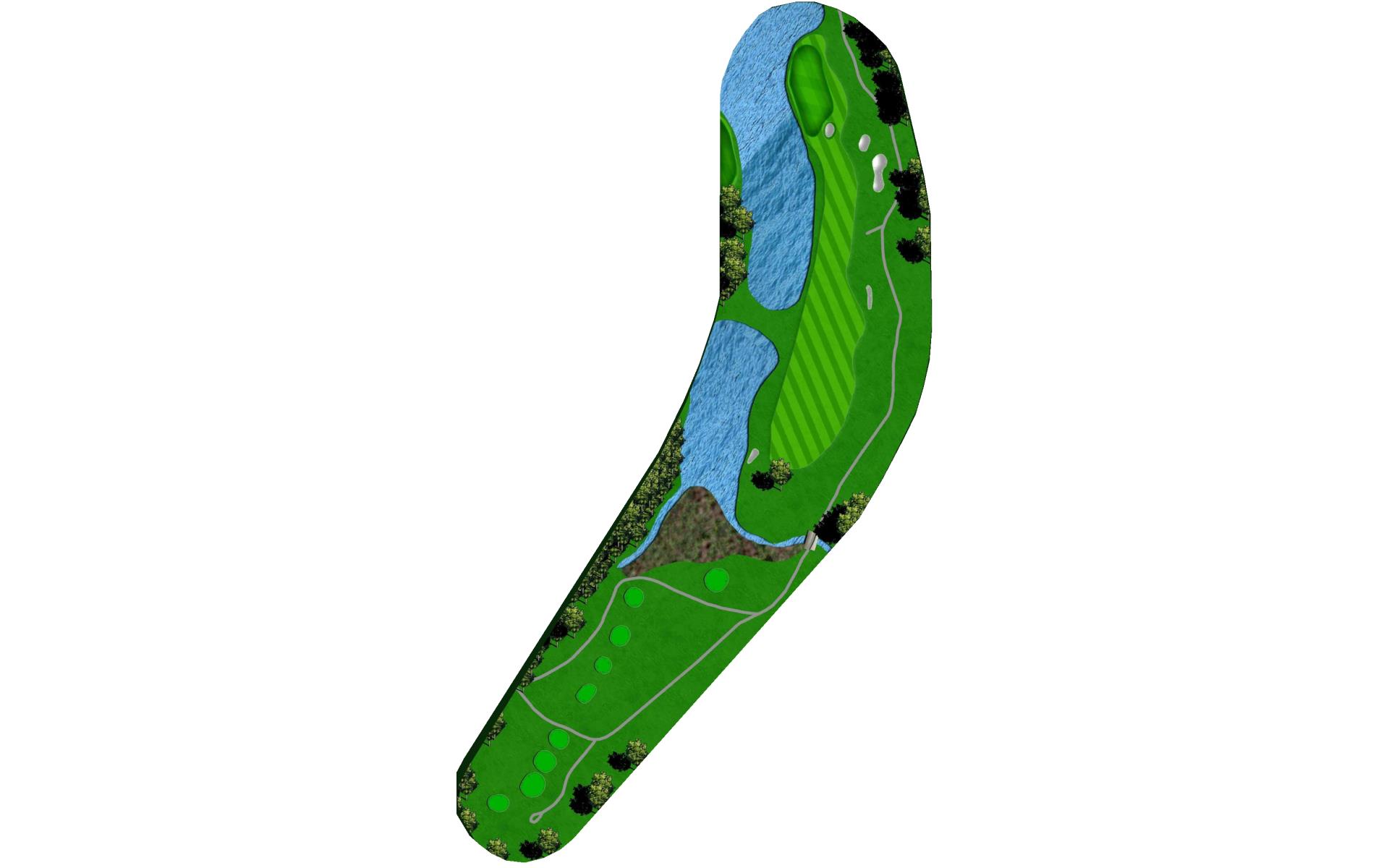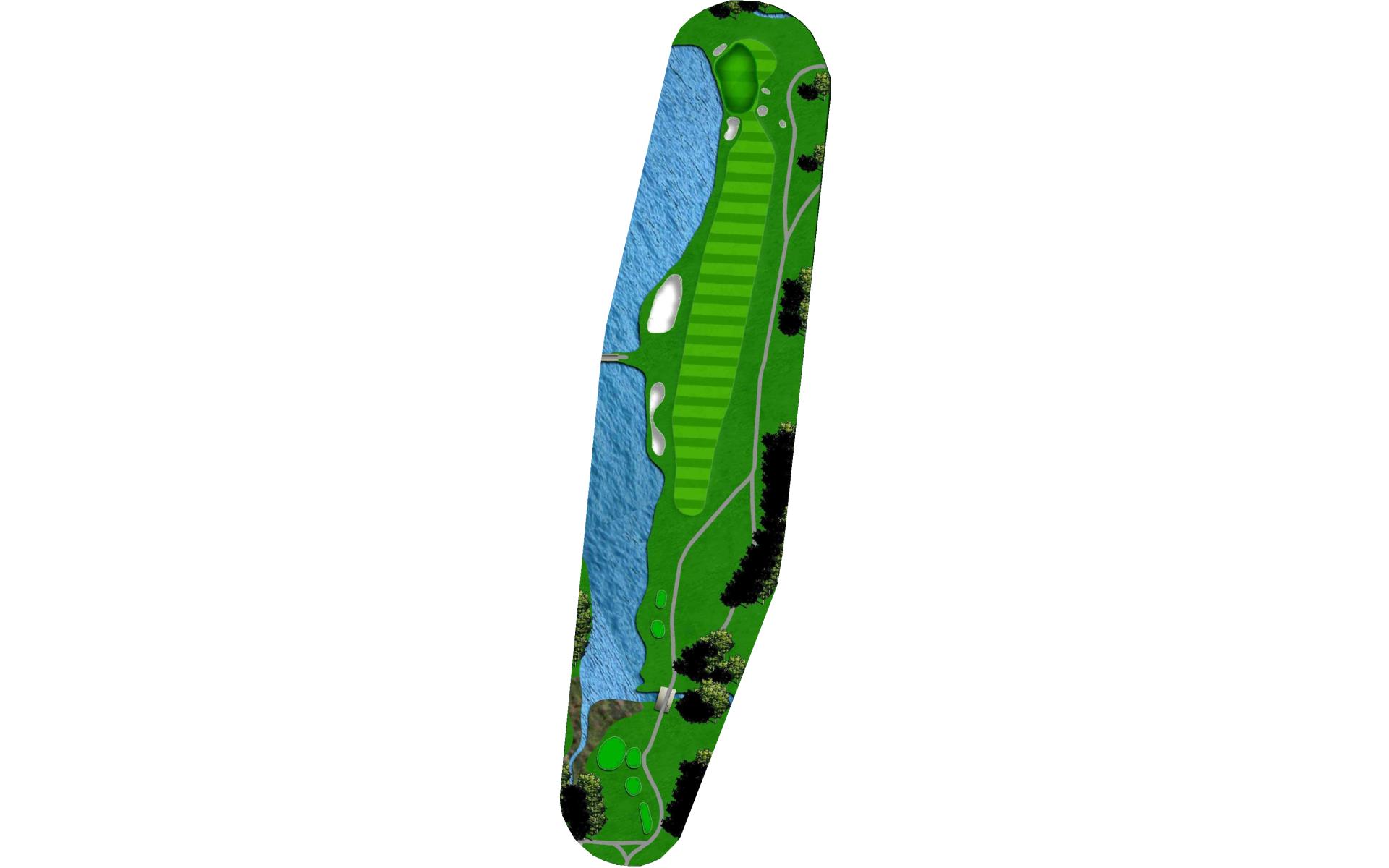 Short par 4 protected by two ponds and OB on the left. A good drive here can leave short iron to wedge depending on your club choice off the tee. Second pond wraps around right side of green that slopes towards the water. Narrow green makes accuracy a premium.