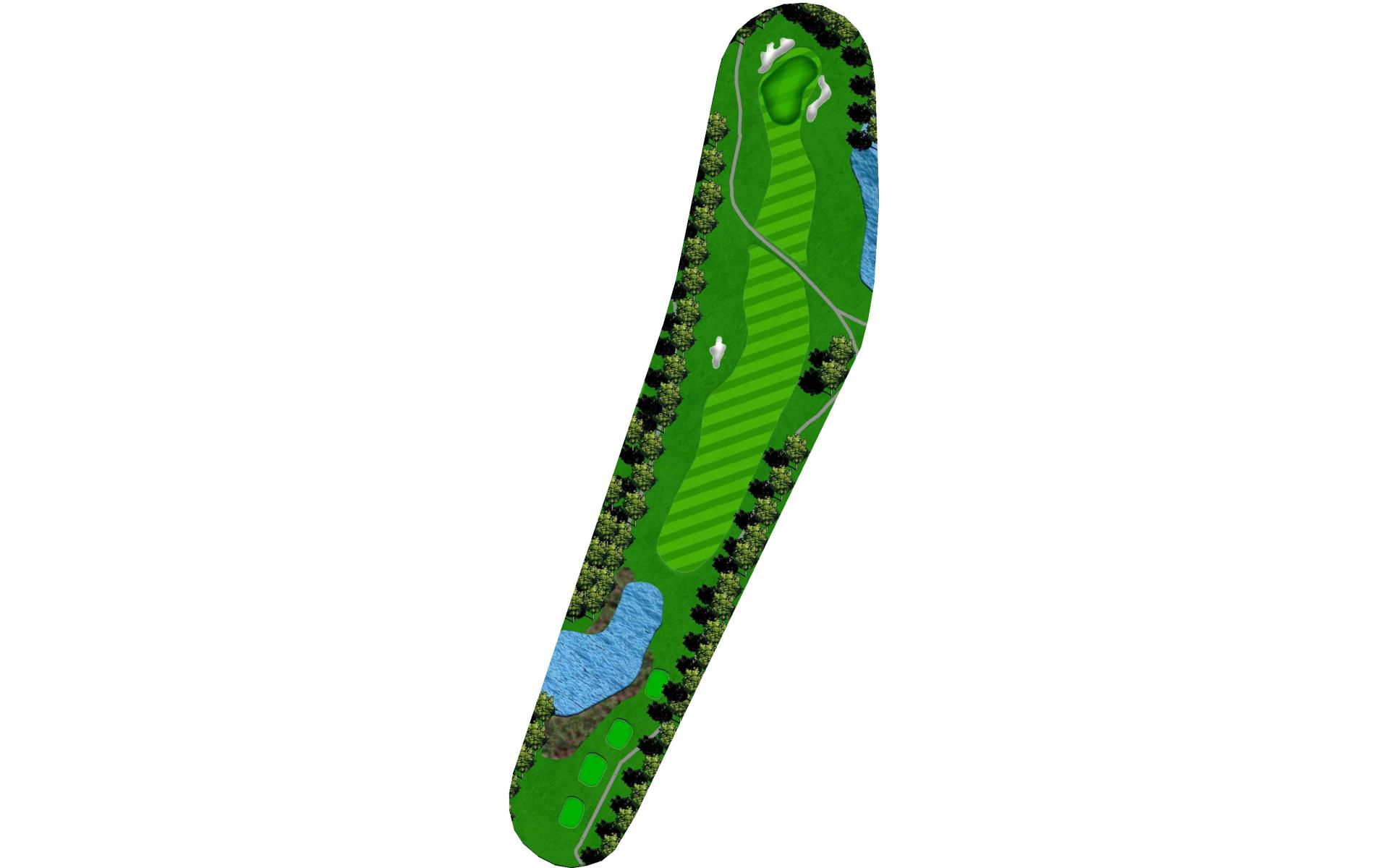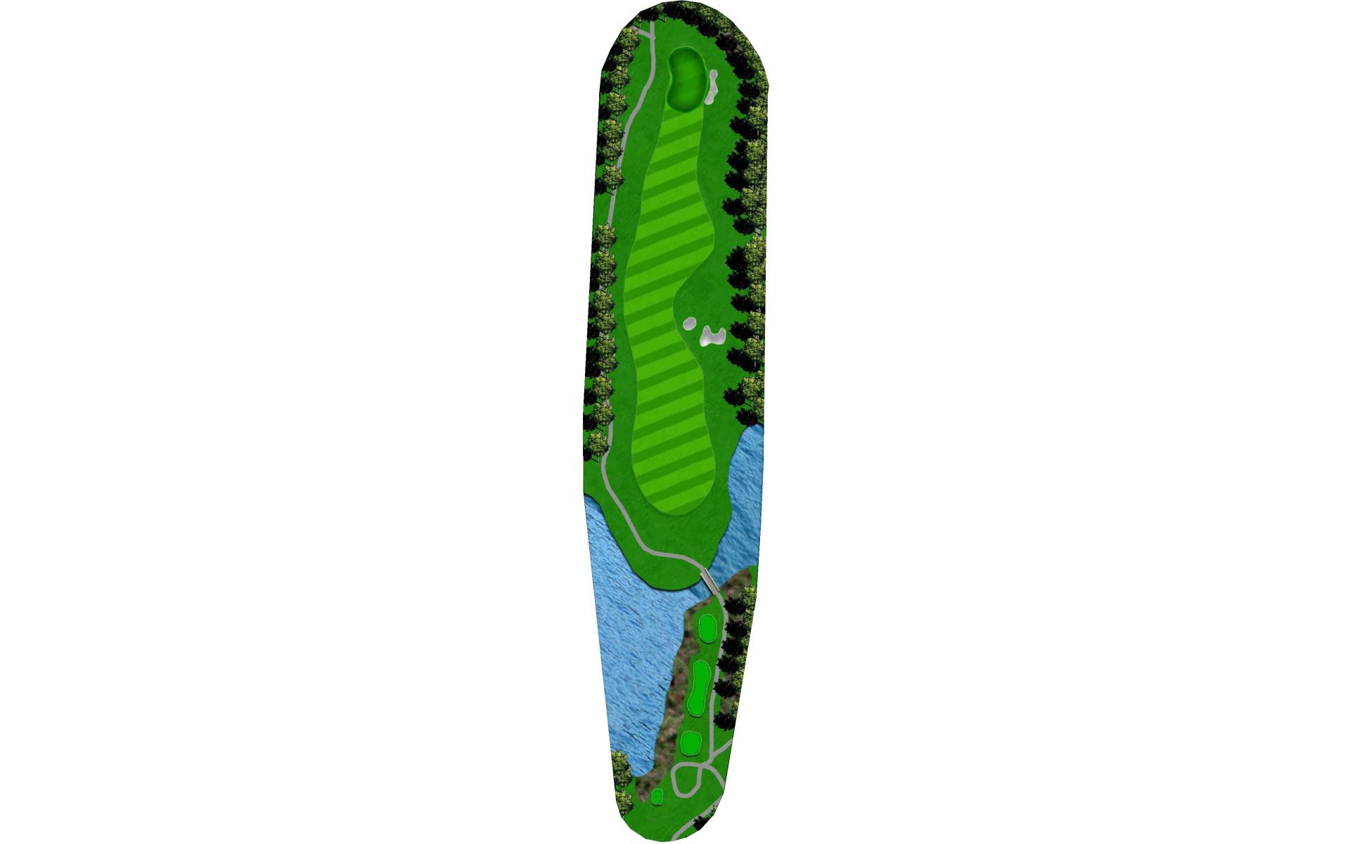 Long hitters can cut off part of the lake’s corner. Keep in mind the wind blows towards the water. Keep ball short of all pin positions.