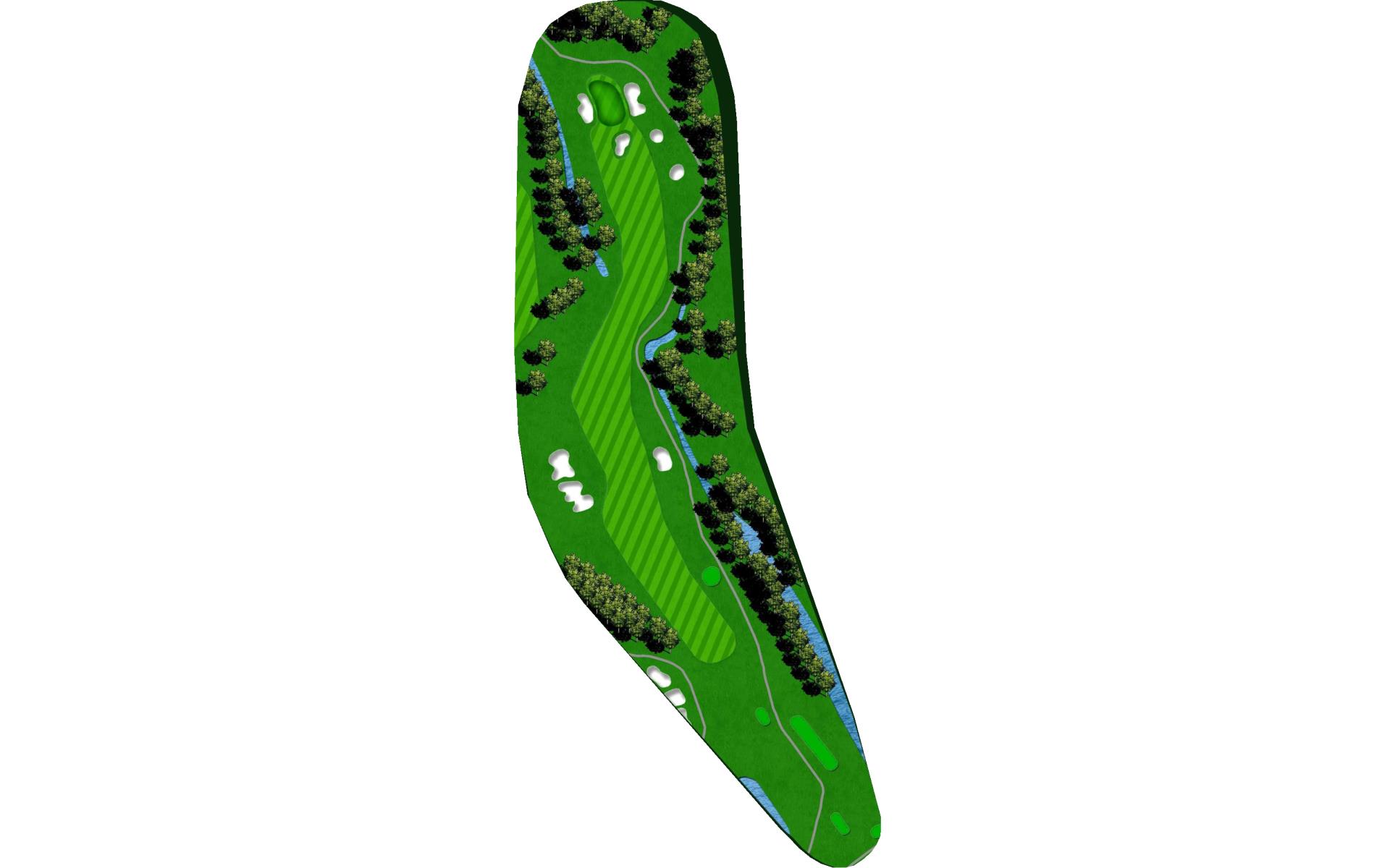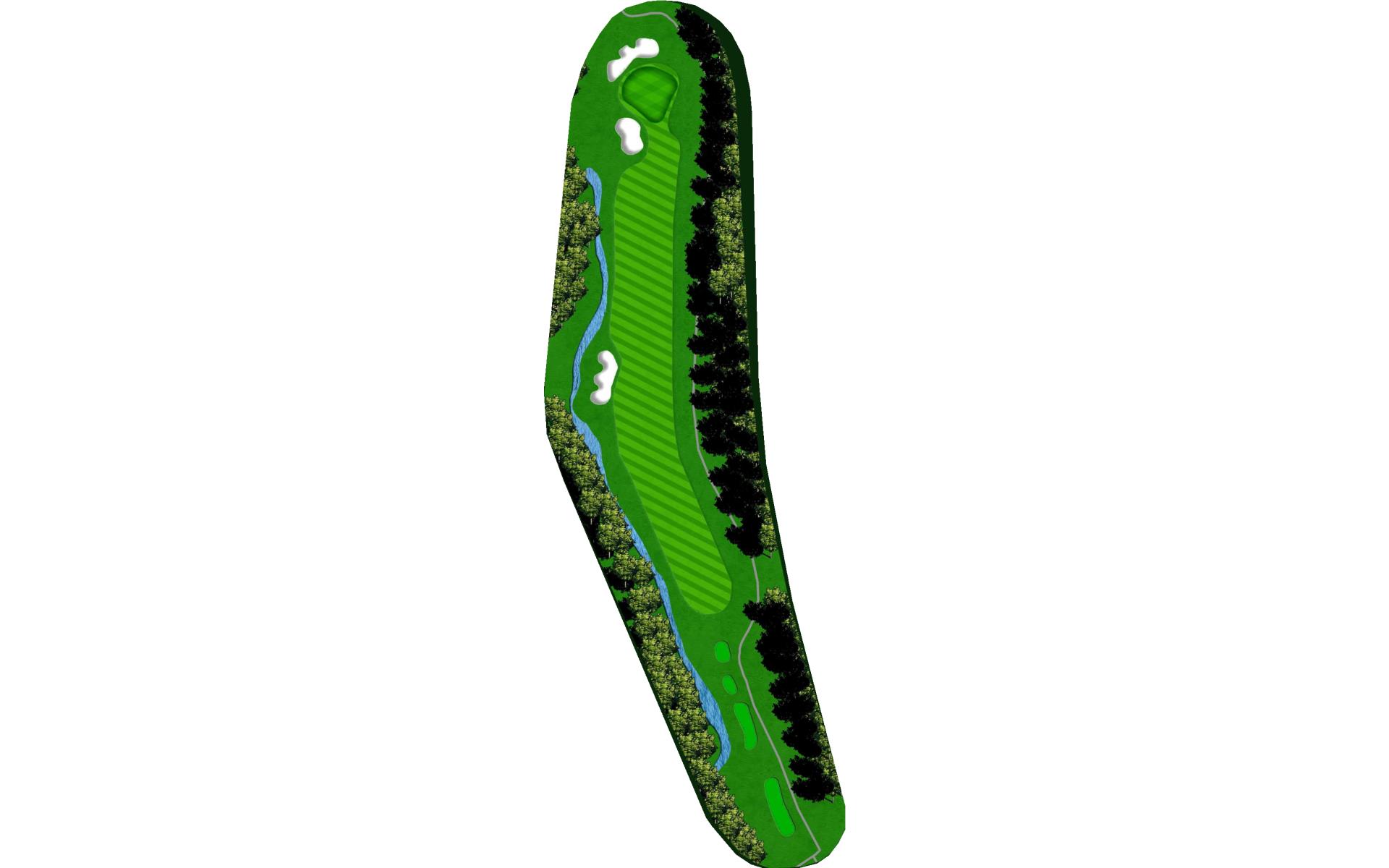 Slight dogleg right with a creek about 250 yards off tee. Avoid the bunker in the fairway, and don’t miss the green to the right.