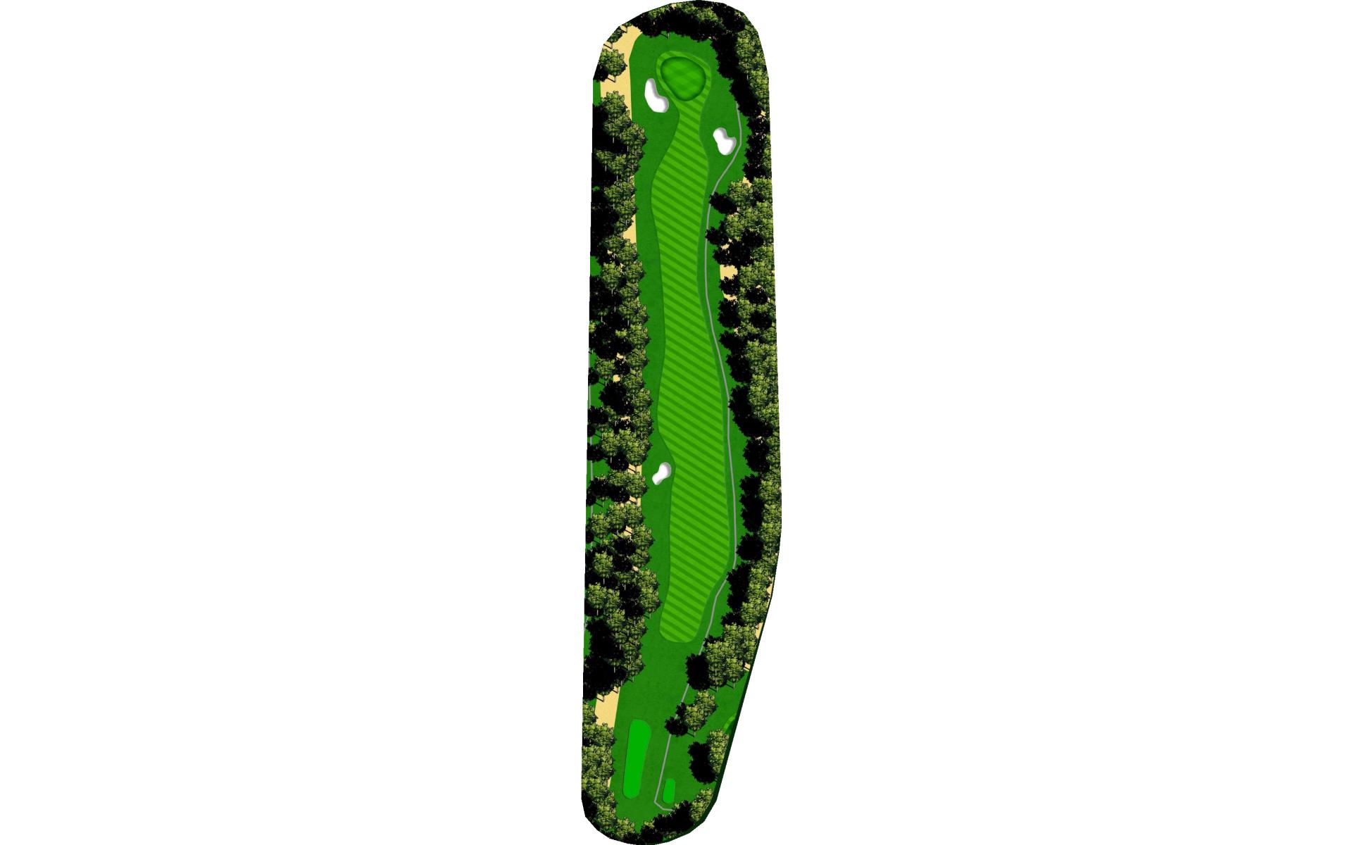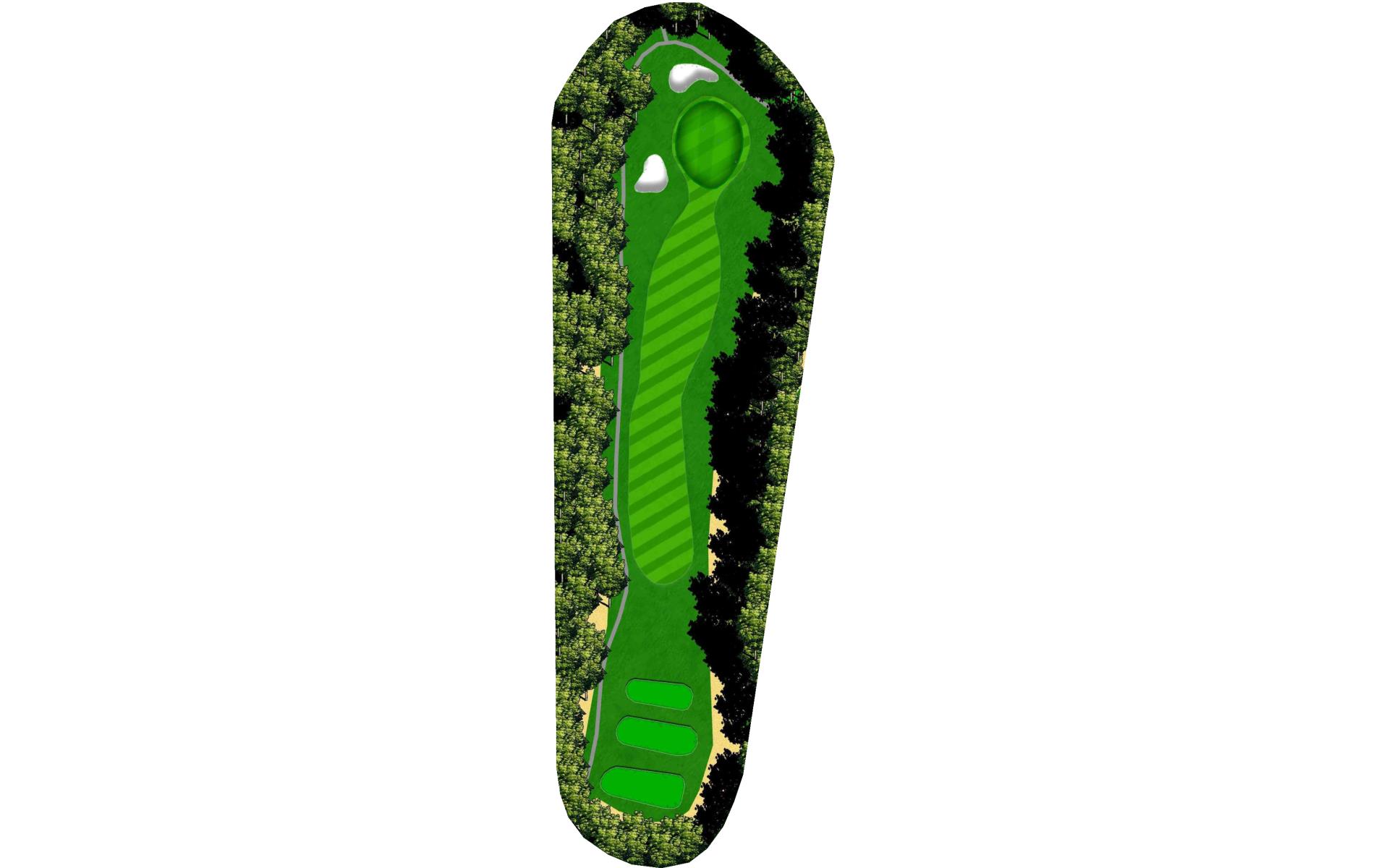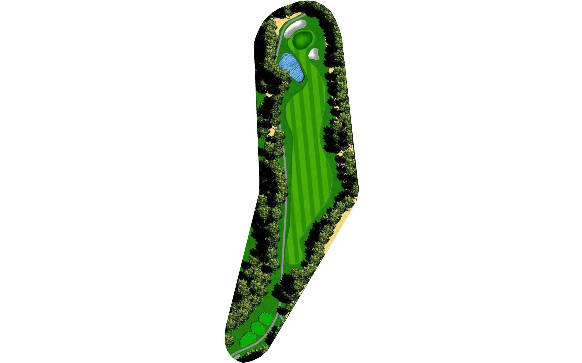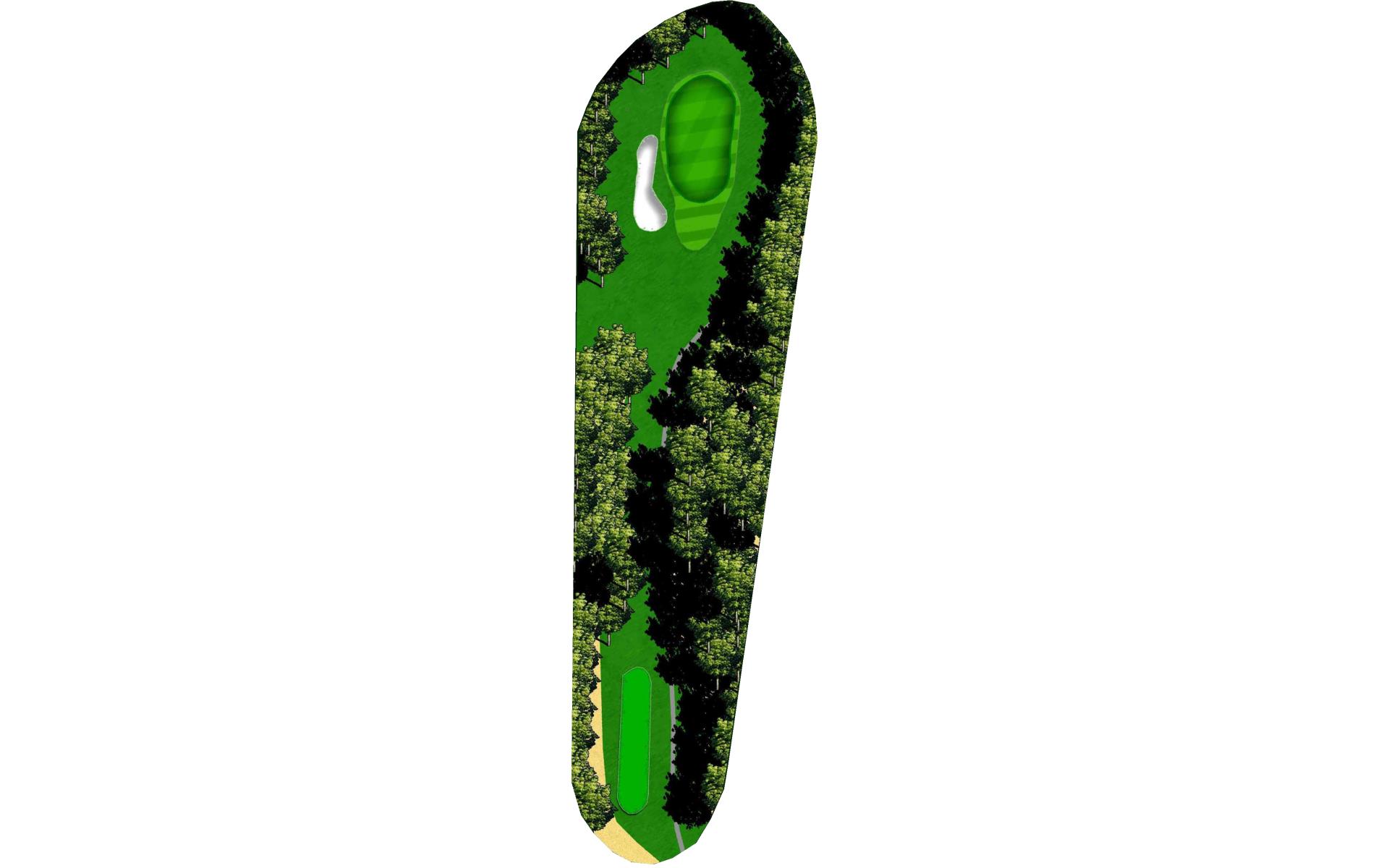 | The sixth is a classic risk-reward par 4. It’s narrow and downhill, so golfers can either bomb a driver up near the green or play it safe with less club off the tee. Out-of-bounds left and right will penalize any wayward shots. |