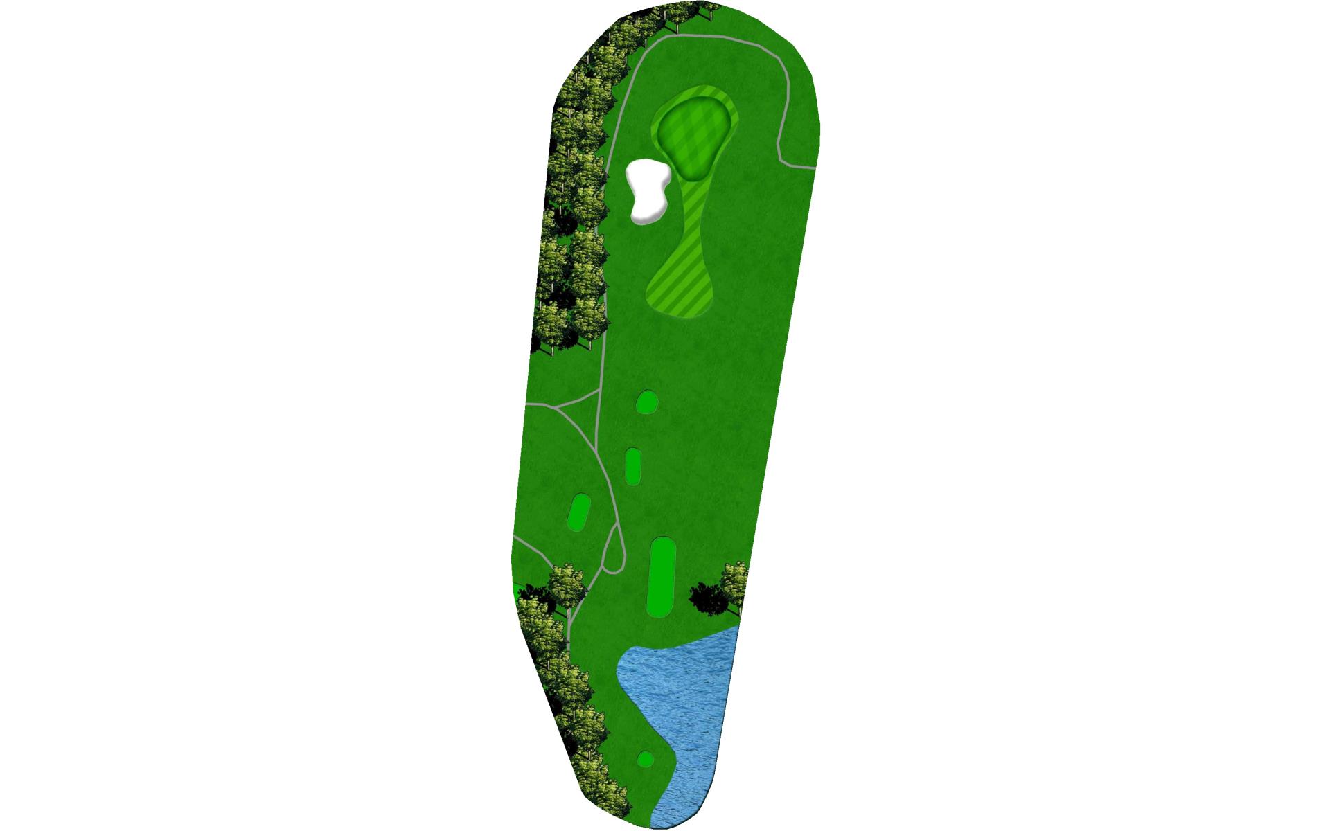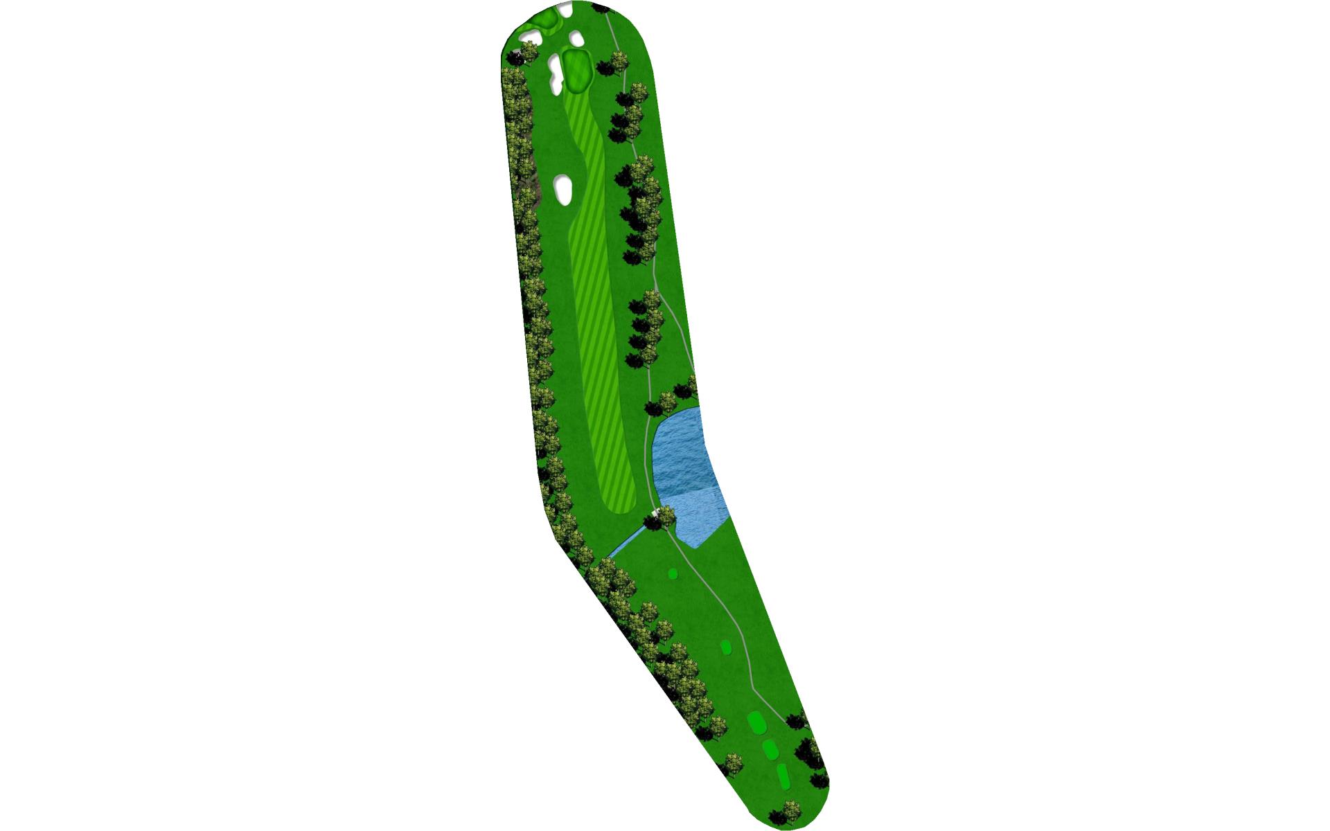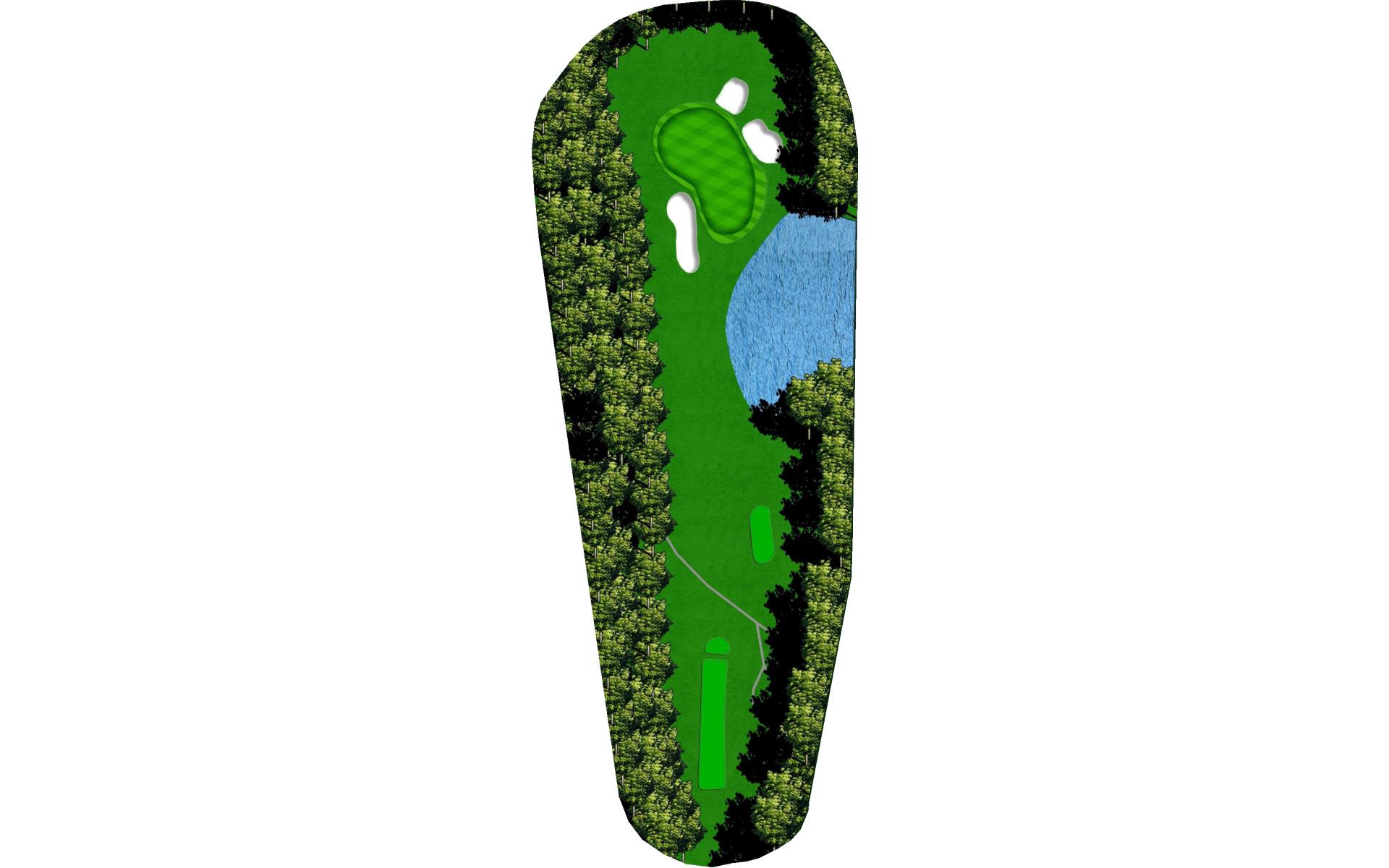 You can play it safe with a drive on the left side of the fairway or you can go over the pond to hit it right in the middle of the fairway. This hole requires a few good golf shots to score well. The green slopes right to left and has a back greenside bunker as well.
