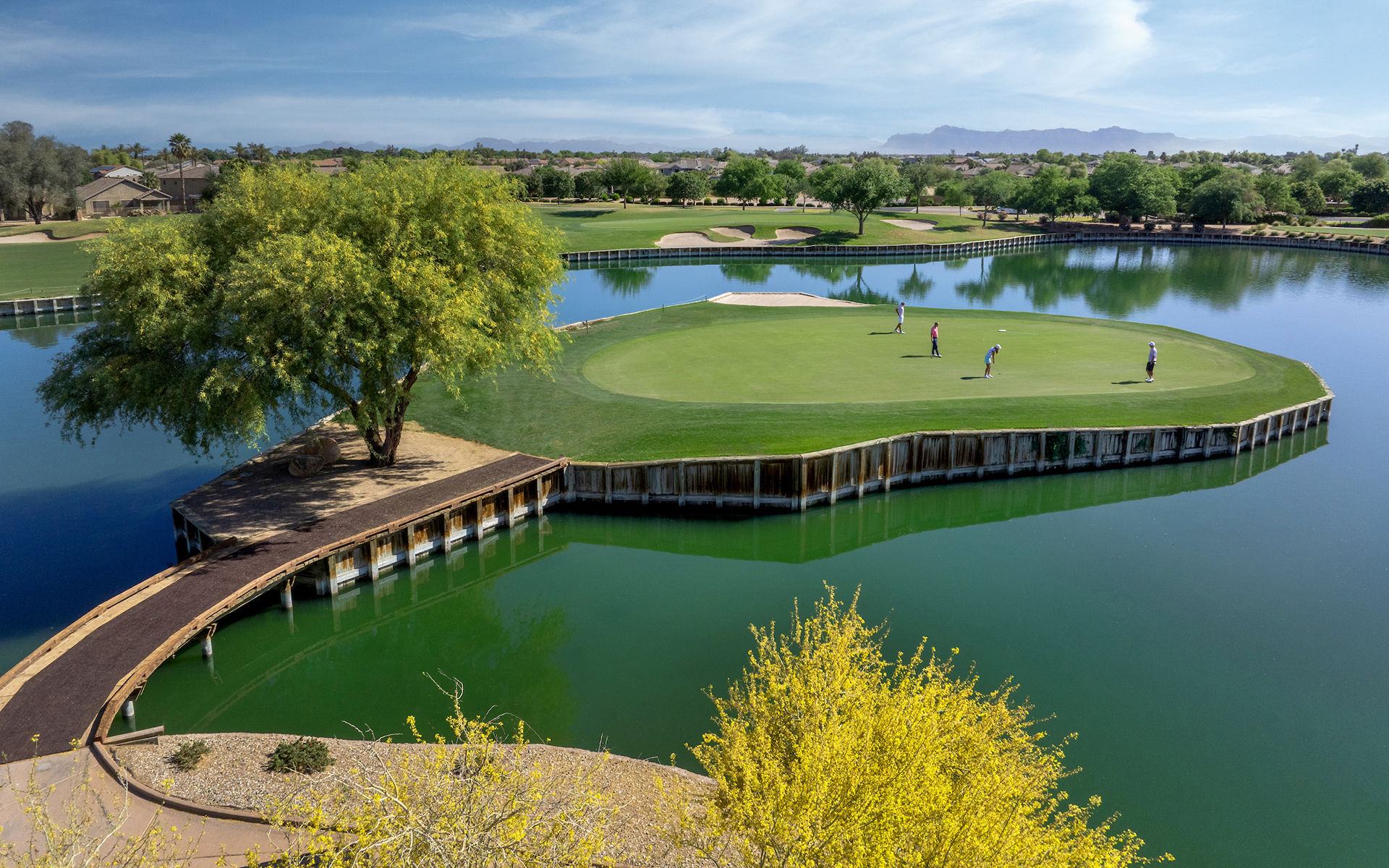 Gorgeous mountain views abound on the 18-hole course, considered one of the premier golf courses in Arizona. This desert course has generous greens, a six-pin rotation for hole placements and our signature par 3 17th-hole island green.