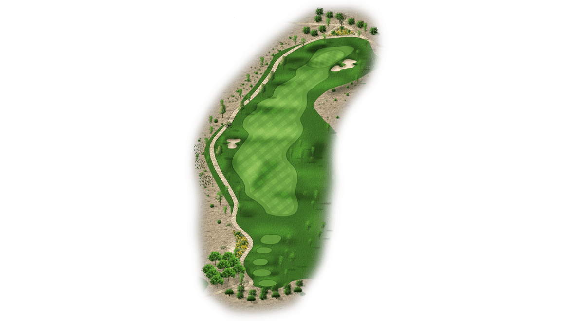 | The front nine ends with a dogleg right par 4. Bunkers on the left side of the fairway and desert on the right make finding the fairway a must. A good drive will leave players with a short iron or wedge into this long, narrow green that’s protected by a bunker on the right. |