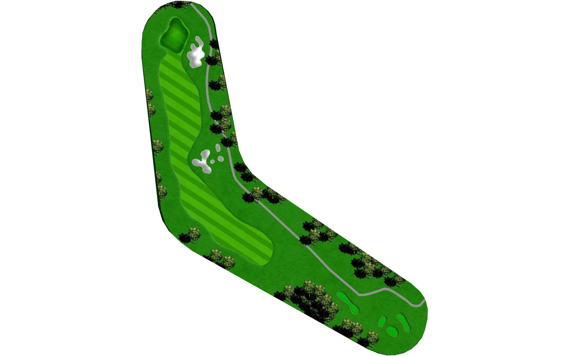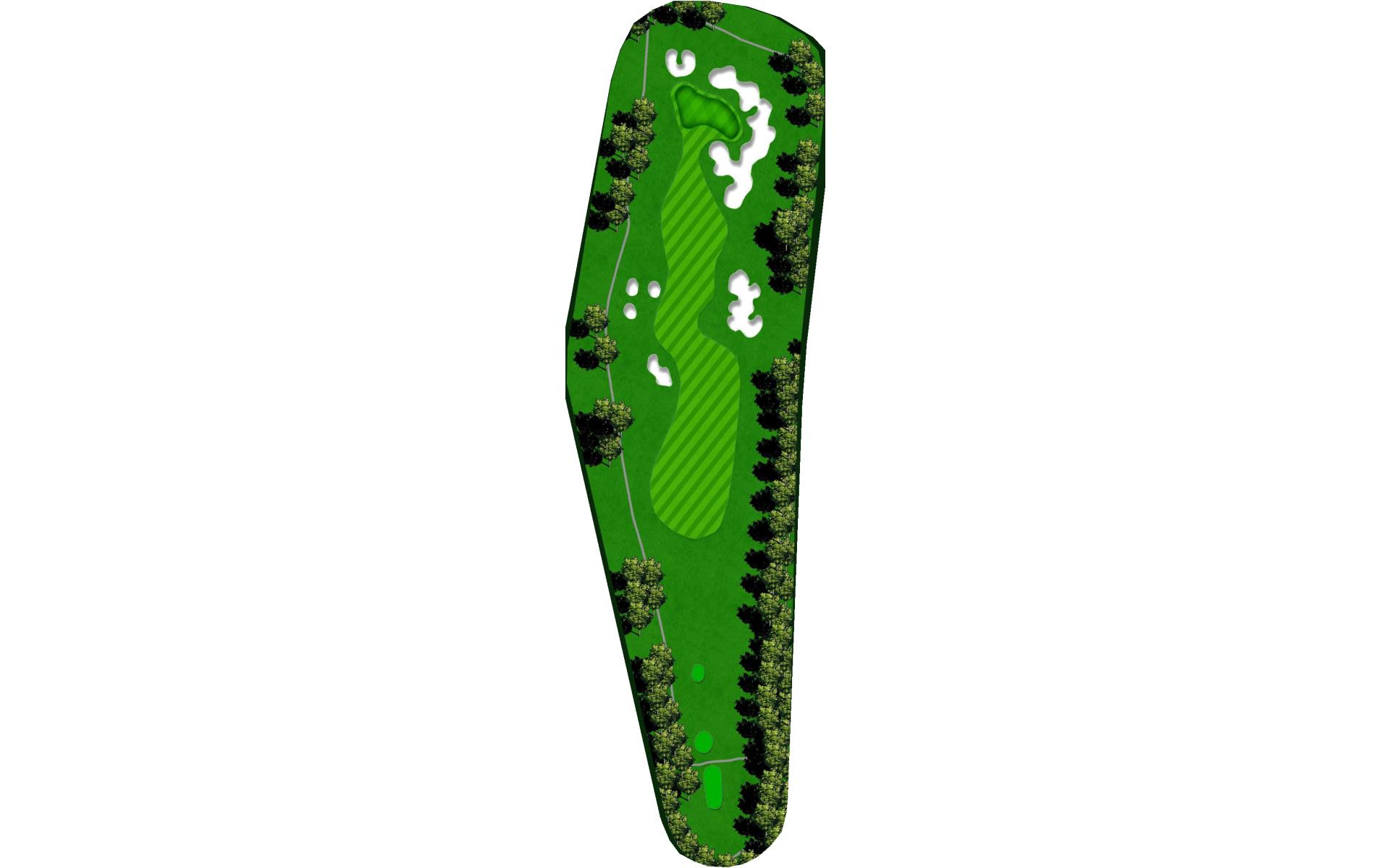 A short, downhill, dogleg left Par 4 to begin the back 9. The safe play is to take a shorter club and play it into the upper fairway, keeping it left of the bunkers. Longer hitters can take a driver over the trees and potentially get on the green from the tee.
