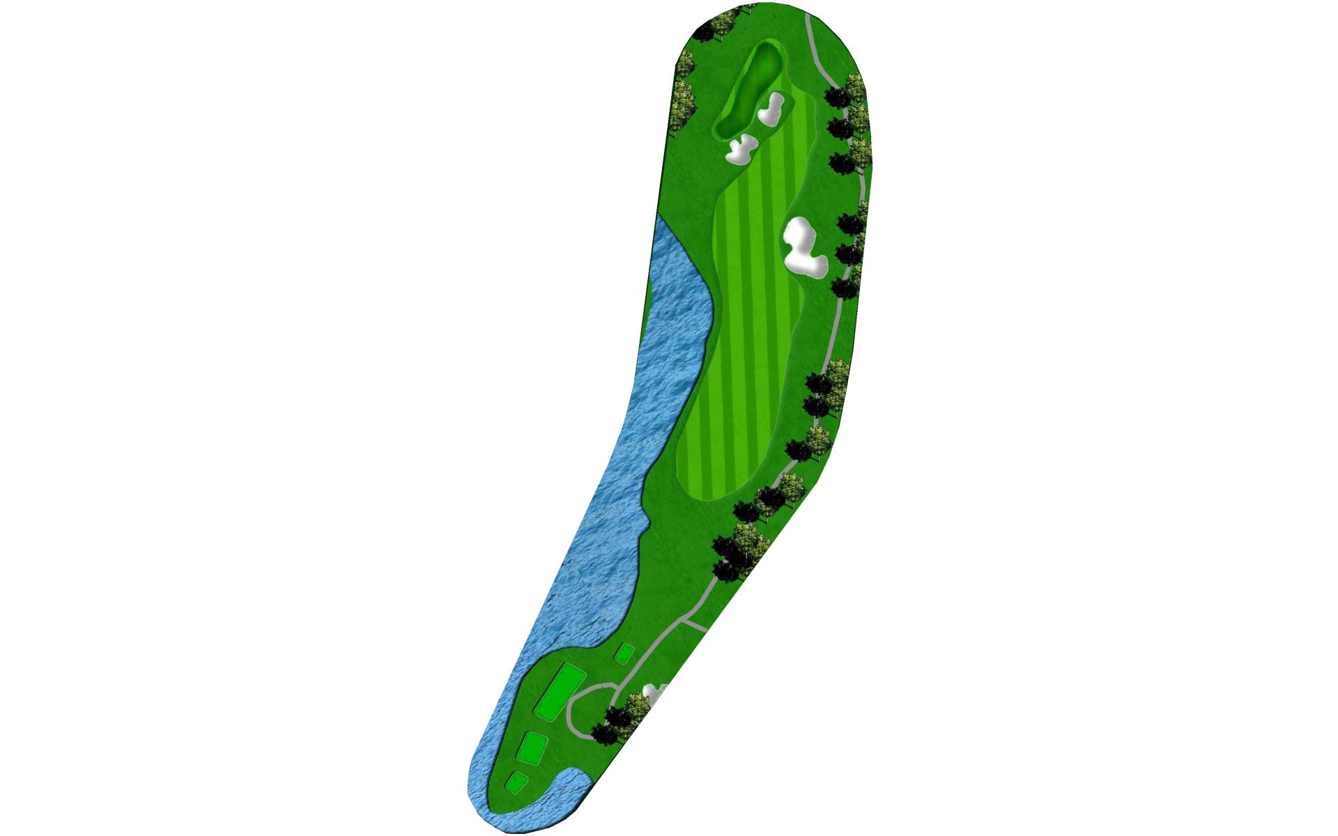 | The final par 5 on the course, "Temptation", is the most reachable. Water divides the fairway in half and some players need less than driver off the tee. Out-of-bounds running down the right side is certainty in play and greenside bunkers short of the green stop balls from rolling up if going for it in 2. |