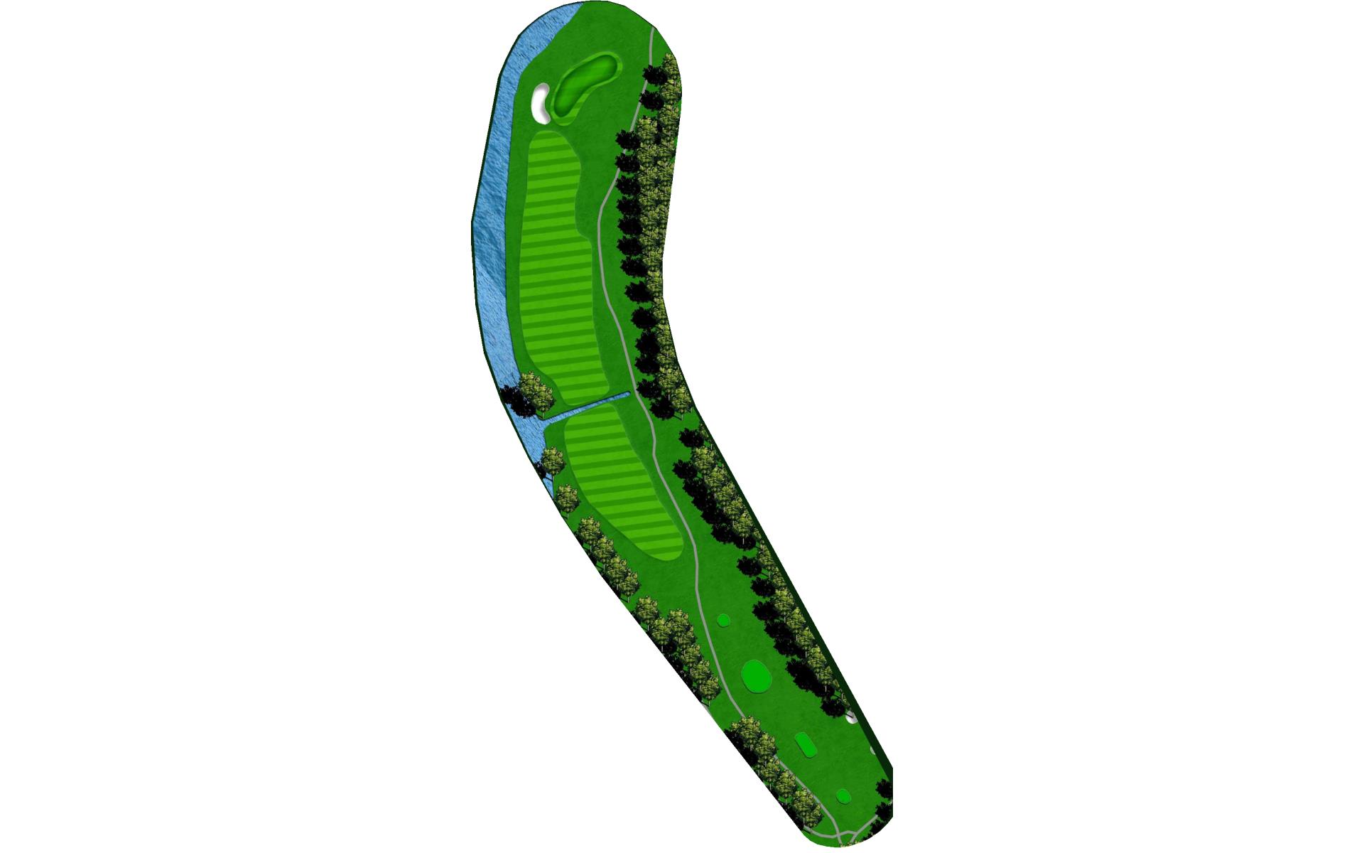 Par 5 that snakes around a huge water feature down the left side of the hole. Tall trees guard against long hitters against reaching the green in two, making the correct layup yardage critical.