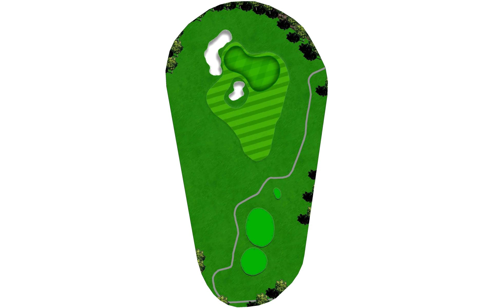 This is a fun Par 3 after navigating the previous holes. The players must negotiate a deep bunker in front of the green and avoid a large bunker to the left. The front bunker divides the green into right and left sections each having their own slopes to navigate. A shot on the wrong side results in a challenging put, but a well-placed shot provides an opportunity for birdie. This hole provides a breather before the more difficult holes heading back to the clubhouse.