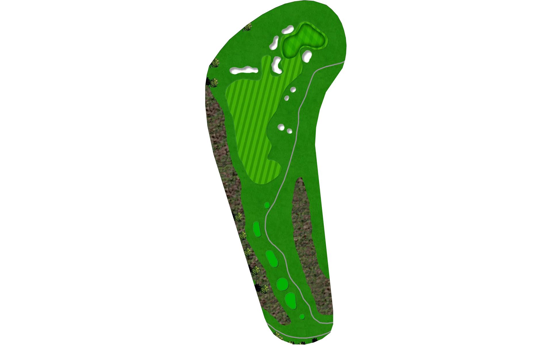 This is a great finishing hole with two separate fairways to choose from. The left fairway requires less carry over the existing wetland but sets up a more difficult second shot over a lake – all carry. The right fairway is narrower and requires a longer carry over the wetland but a shorter approach with no lake to navigate. The awaiting green slopes severely towards the water and sits below the clubhouse with bunkers to either side.