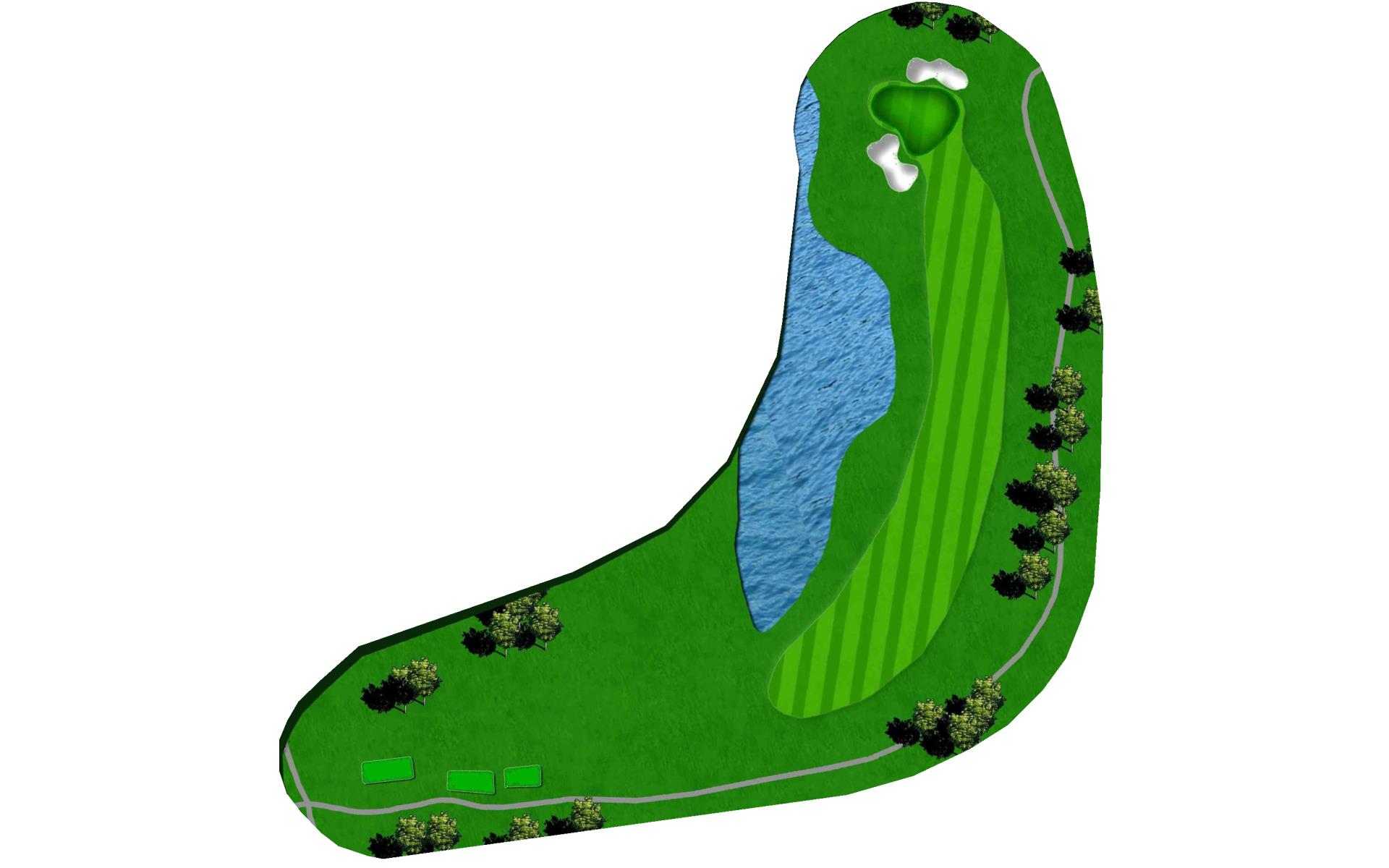 This par 3 is surrounded by bunkers and pond on the right. The safety play is short and left of the green. Long left or right will make for very difficult up and down.