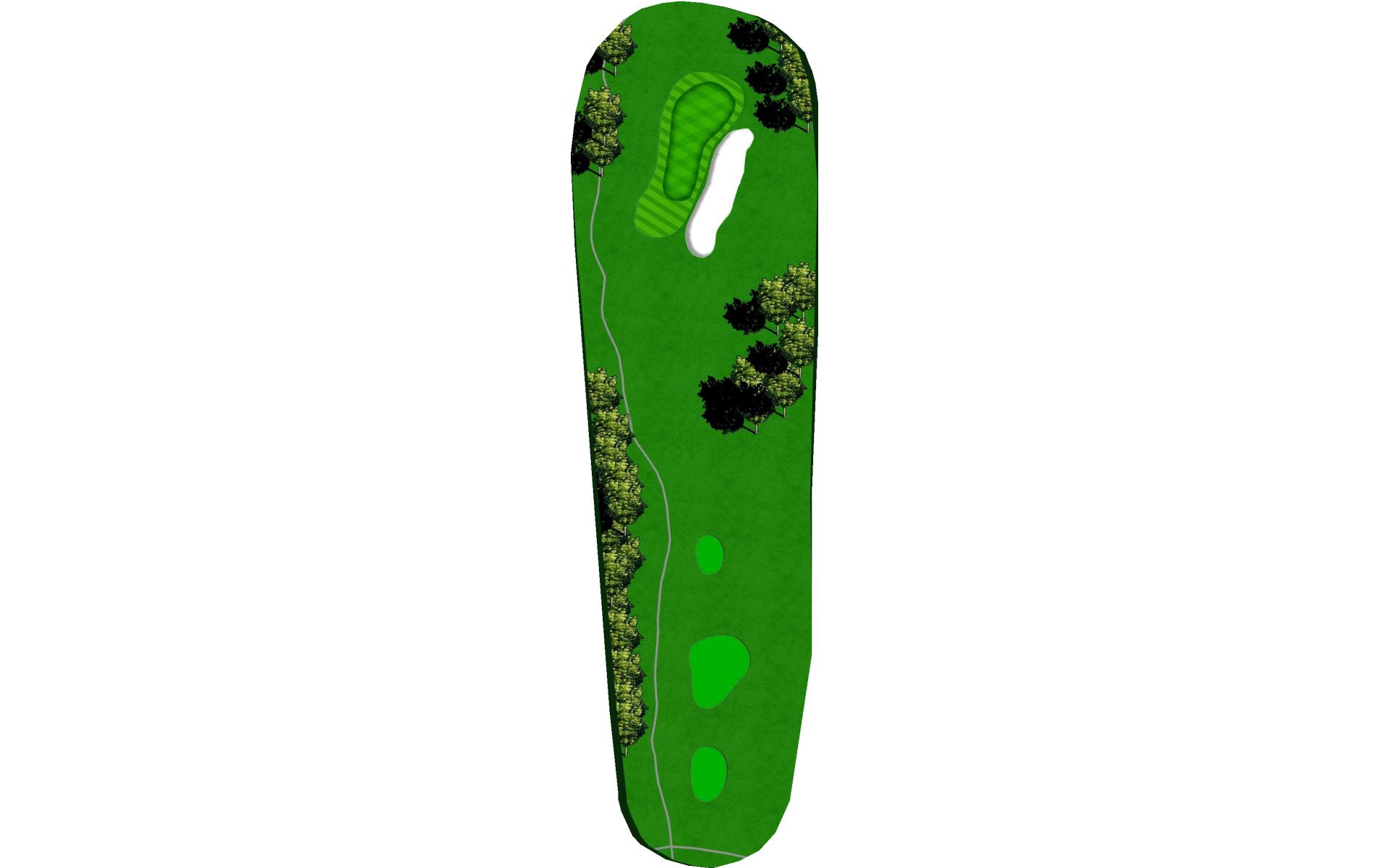 A medium length par 4 that dog legs slightly left. Tee shot should favor the right side of the fairway. A strong tee shot with some draw shape is ideal. The large tree on the left side of the hole will knock any tee shot too far left straight down into the rough. Favor the right side of the green with your approach shot. Any shot that lands left of the center of the green will release left quickly toward the creek. First bounce is typically firm, so play for some release.