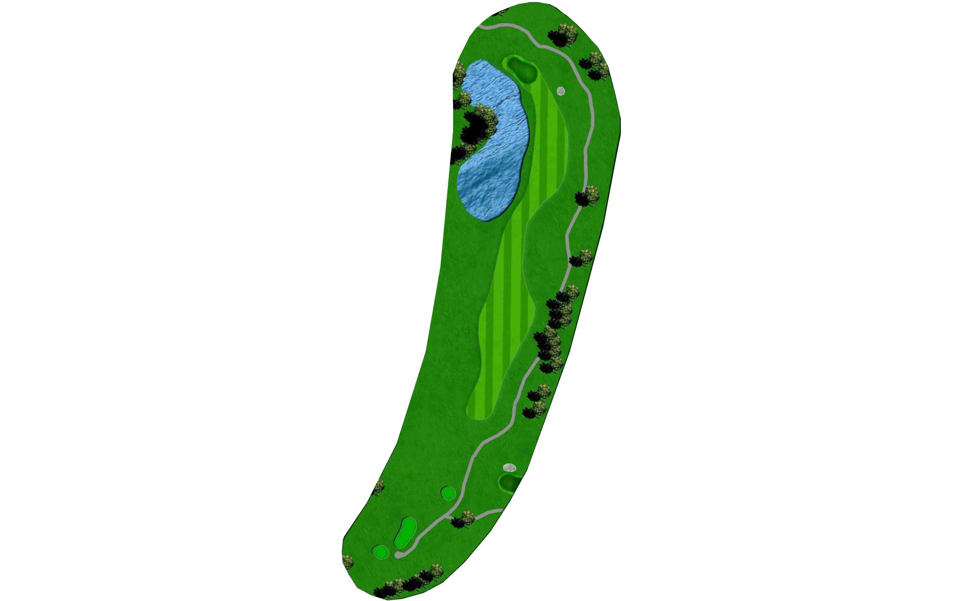 Average length par 5 with a massive fairway. You can hit down the right side or the left side from the tee. Aggressive players will favor the left side in order to have a shorter 2nd shot into the green possibly. If you’re playing this hole as a three-shot par 5, then you should favor the right side and stay away from the pond on the left. Distance control is key on your 3rd shot. Anything short of the middle of the green may feed down toward the water greenside. Long is an acceptable miss, but your nerve will be tested as you pitch back toward the water.
