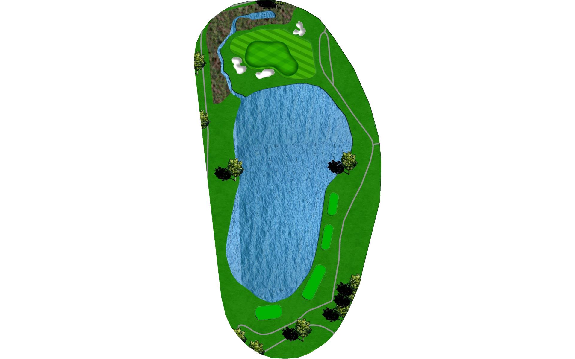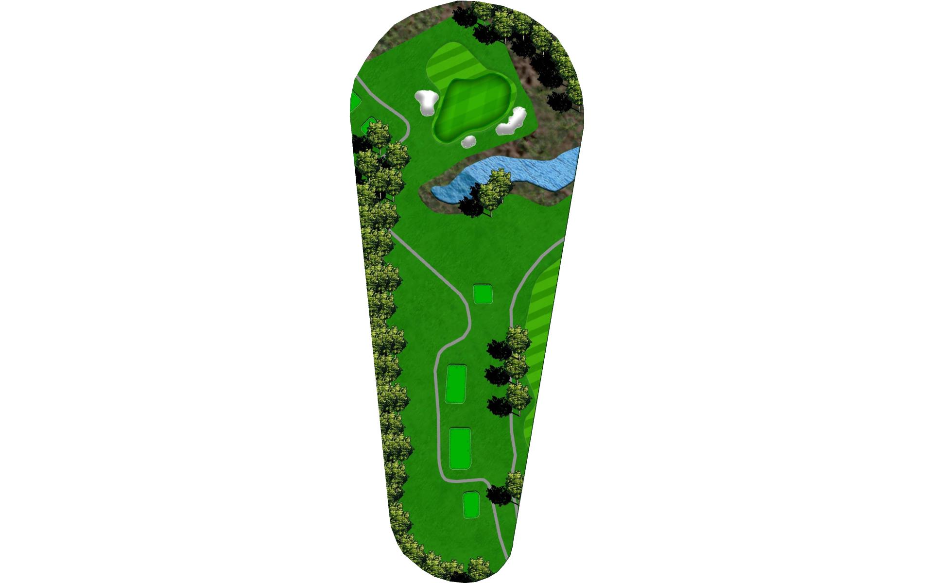 Drive it straight at the telephone pole through the fairway. There’s a slight dogleg left with a green that slopes severely back to front.