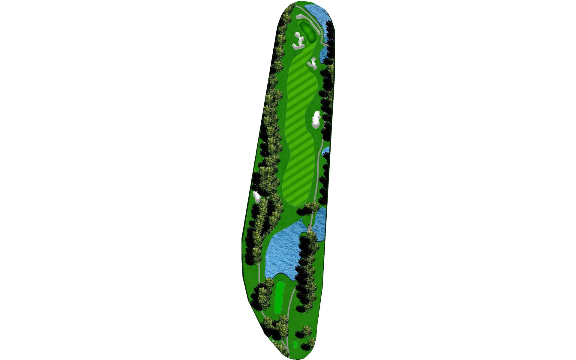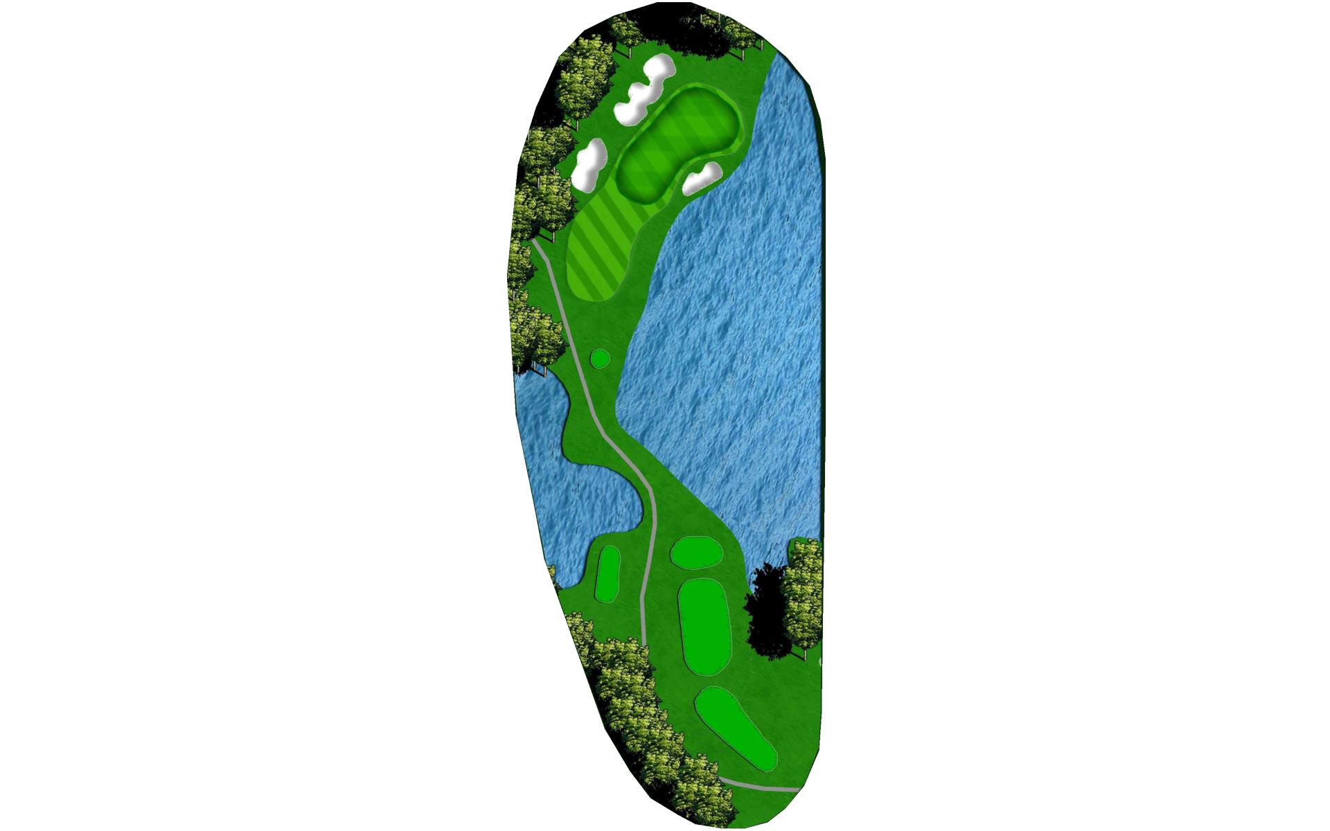 | A good risk/reward hole. If laying up, be aware of the lake in front of the green. If going for green in two, be careful not to go short, long or right as there is water everywhere. A very challenging green to get the ball close. |