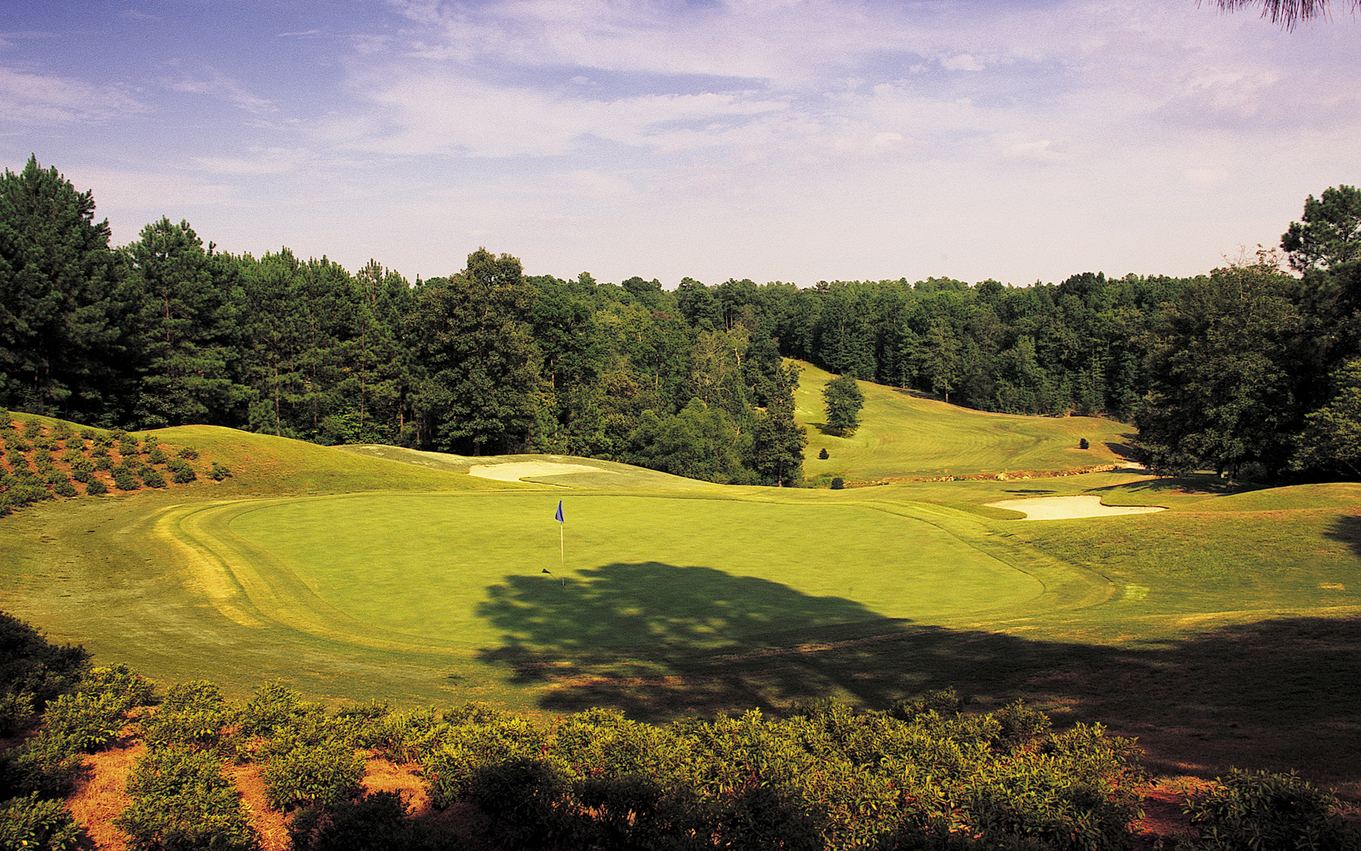 Bombs away again on the long par 4 finish. A good drive will leave a long iron in. The green slopes uphill, so be sure to leave the ball short of the pin for an easier putt. Beware of the slopes, though, as even an uphill 4 footer can lead to ole Mr. Three-Wiggle.