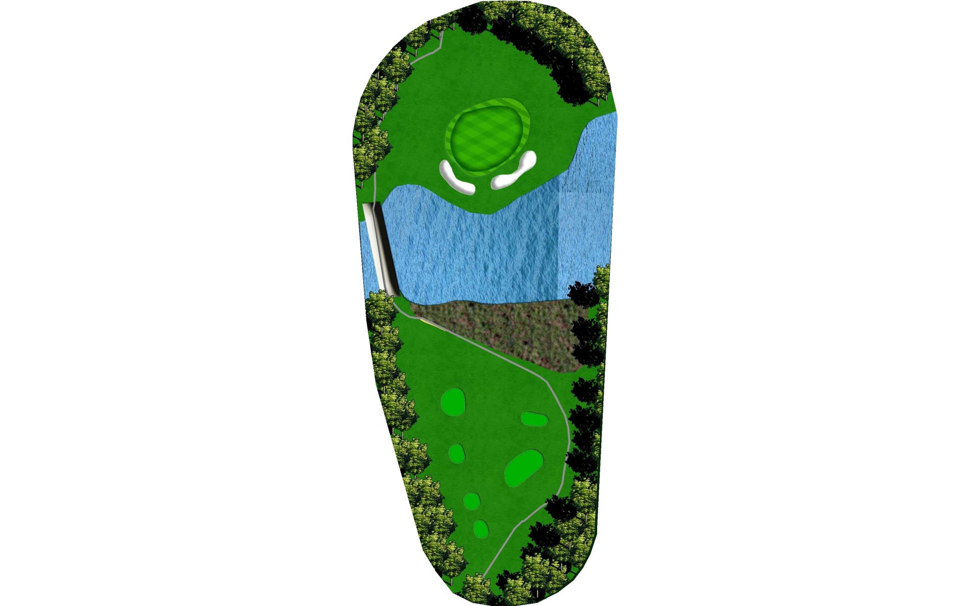 Downhill straight over water. DO NOT LEAVE IT SHORT. A midiron into this par 3 is the ideal shot. The green is wide and long, so give yourself plenty of room.