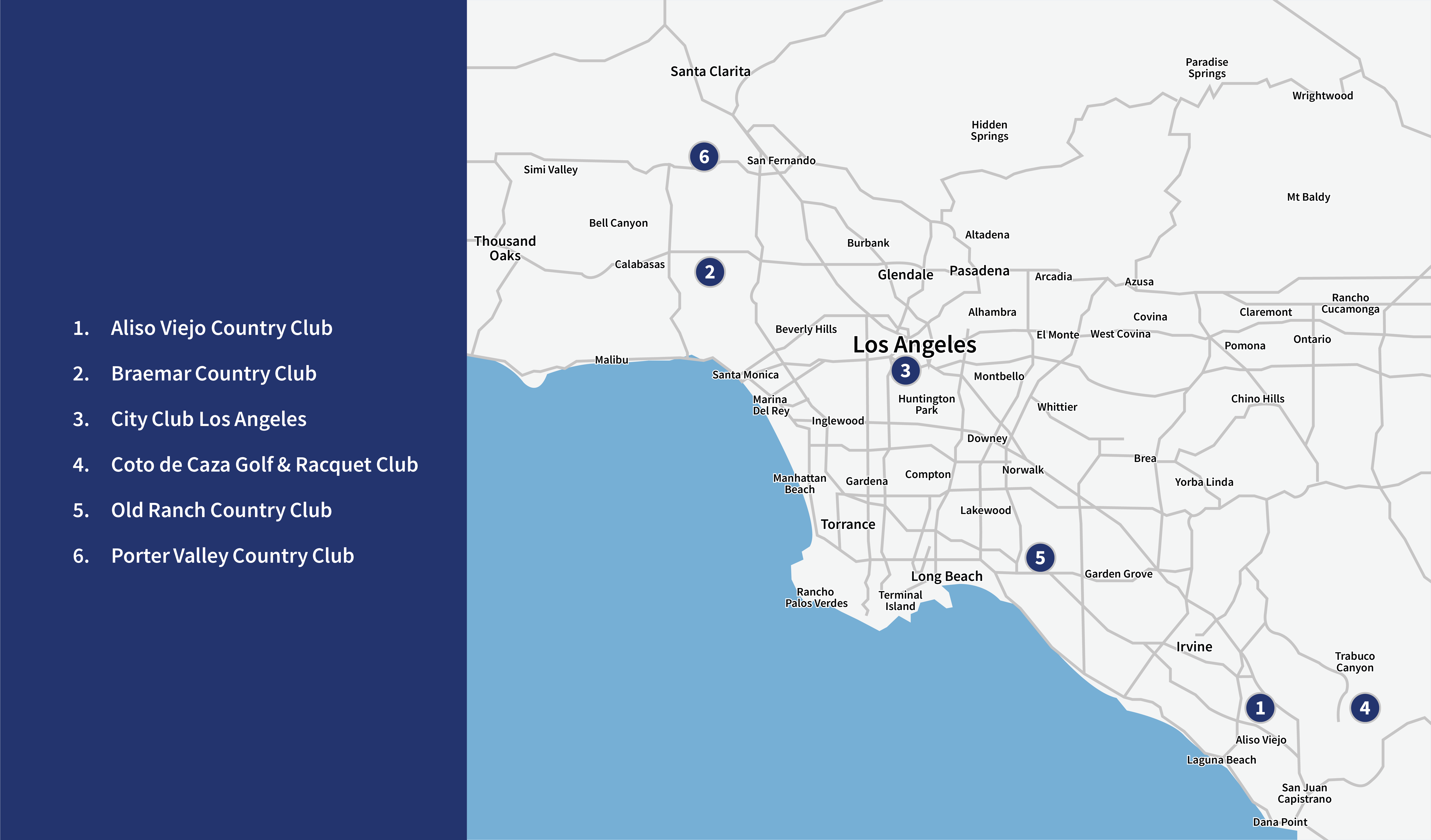 Explore our 6 Los Angeles-area country clubs to find the best club for you. Whether you're hosting a corporate event or looking for a premier venue for team-building, our clubs offer the ideal setting for your next event.